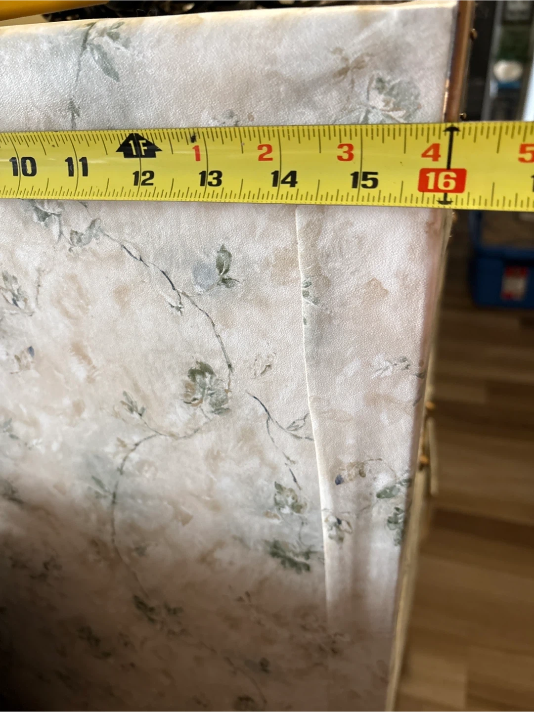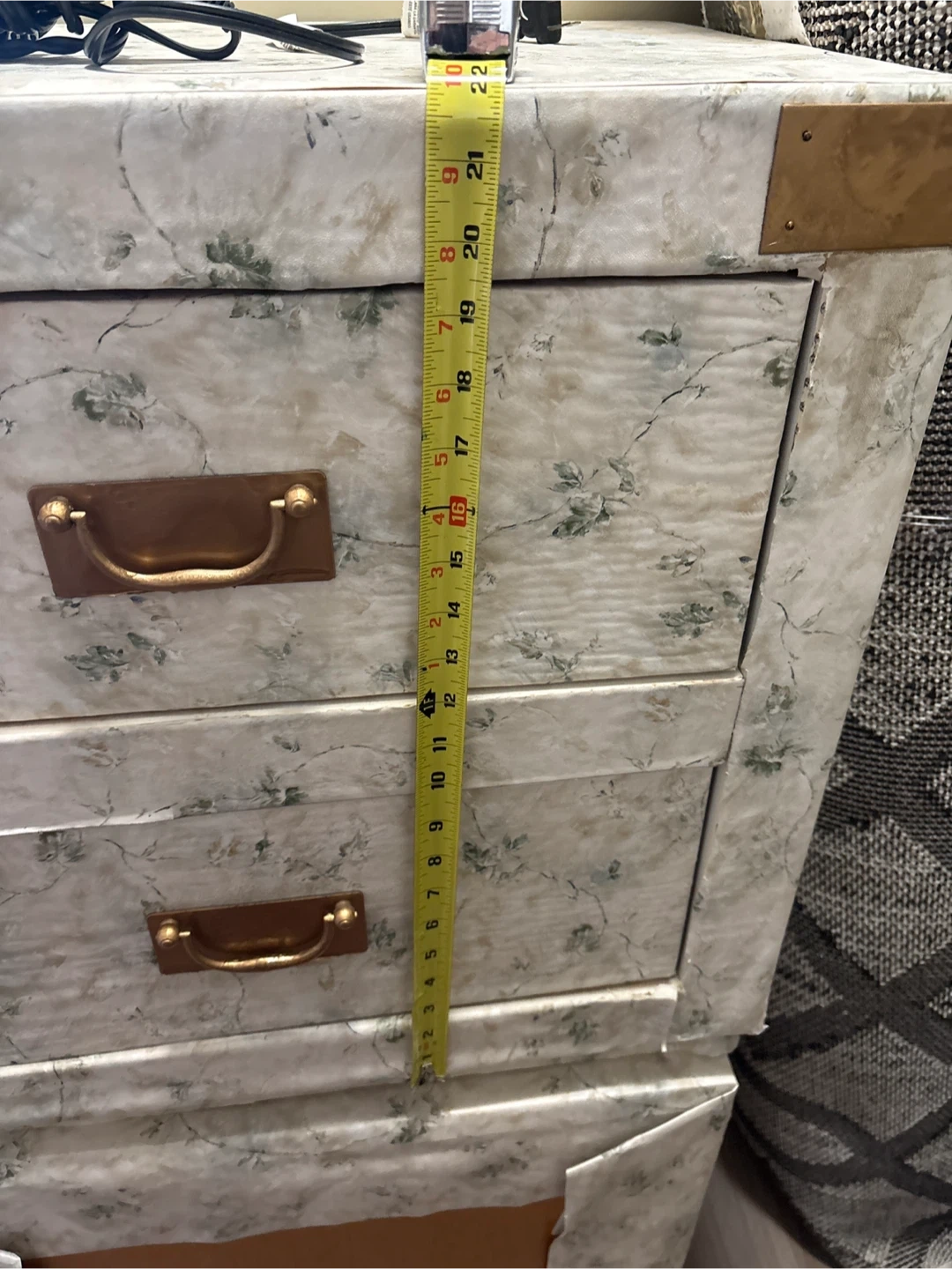 Two drawer nightstands from Lea Industries. It features a floral wallpaper design on the exterior and wooden drawer interiors. Drawer dimensions are approximately 14 inches wide and 7 inches deep. The wallpaper can be removed it’s white underneath the wallpaper.