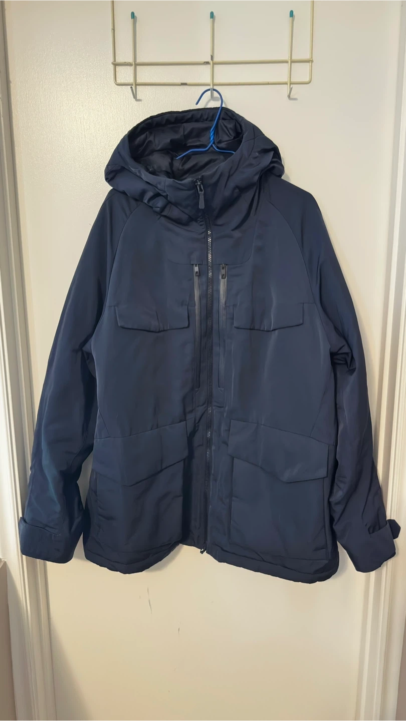 Dead stock!!!! This navy hooded jacket is from the White Mountaineering collaboration with Uniqlo. It's a size L/G and features multiple zippered pockets. It's great for staying warm and dry.