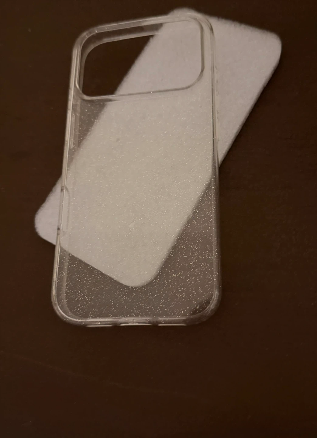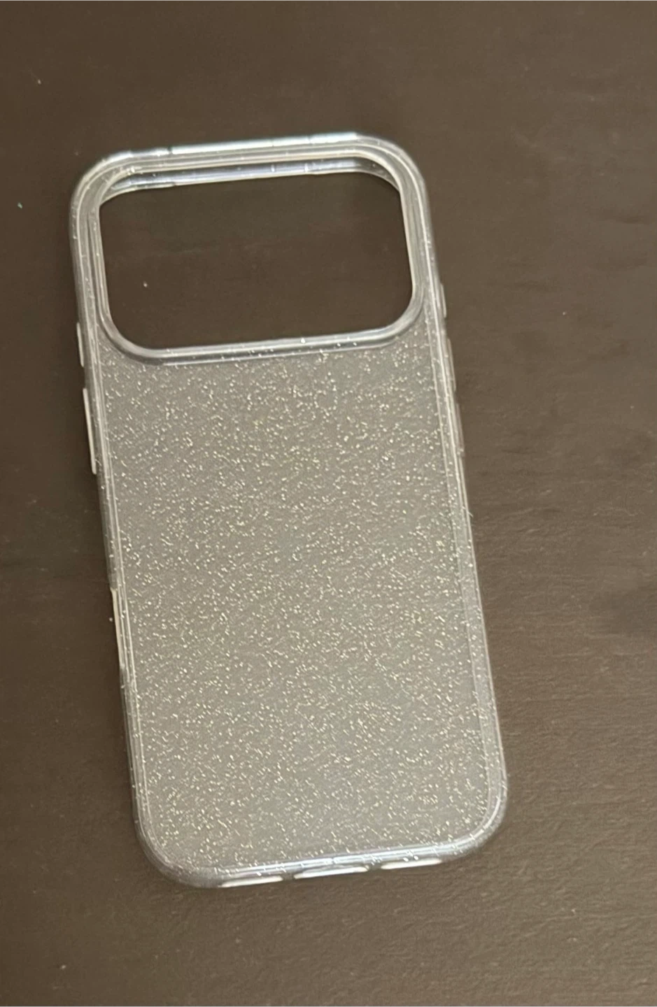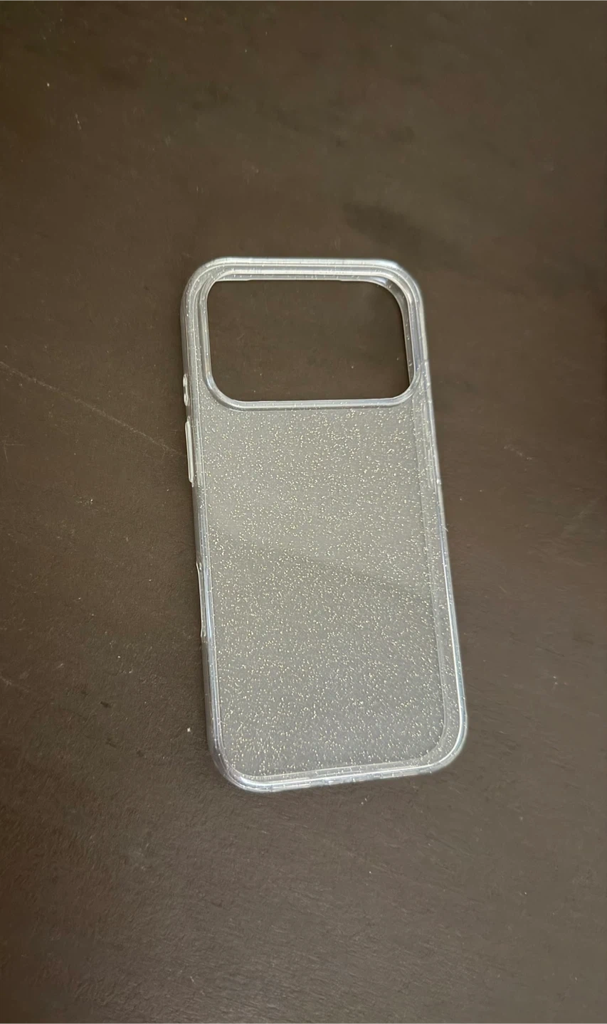 This clear phone case has a subtle glitter design. It's made of a flexible material. It's compatible with certain phone models, offering basic protection.