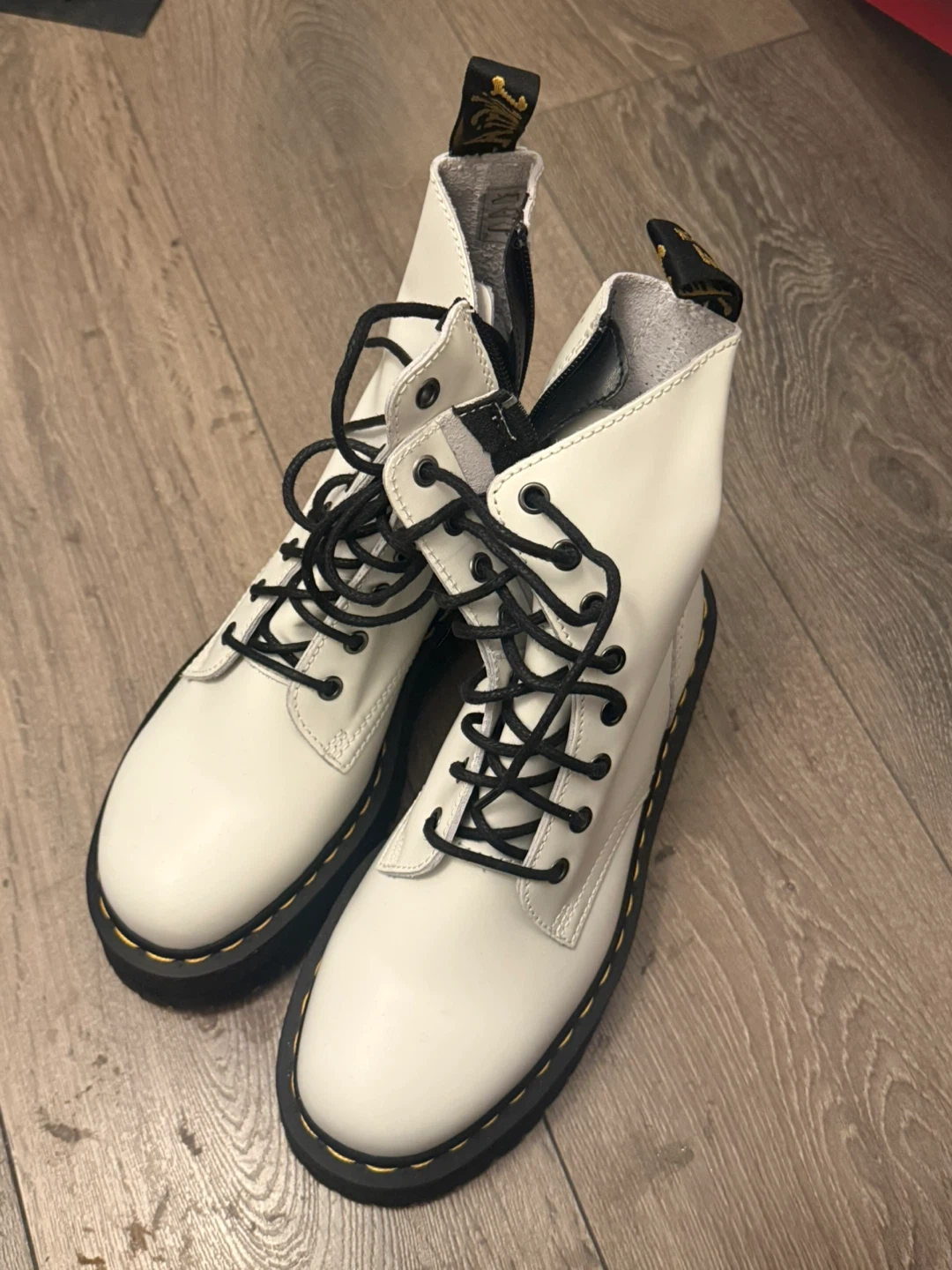 These are classic Dr. Martens 1460 boots in white smooth leather. They feature the signature yellow stitching and air-cushioned sole. Side zippers are also present for easy on and off. These boots are great for adding an edge to any outfit!