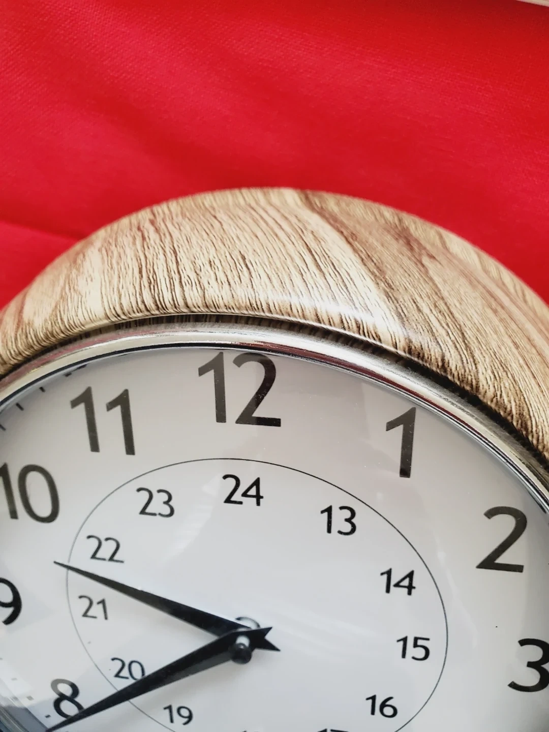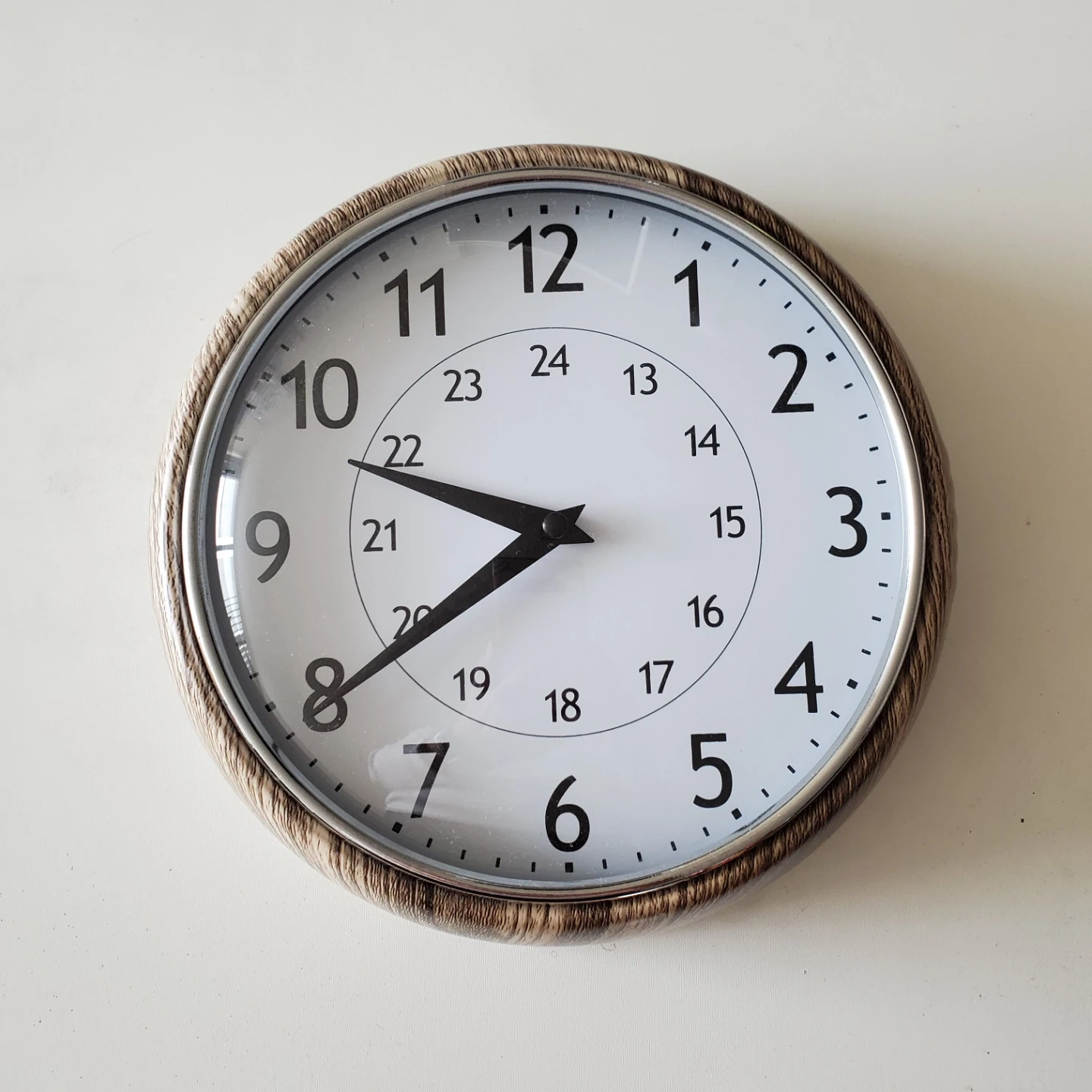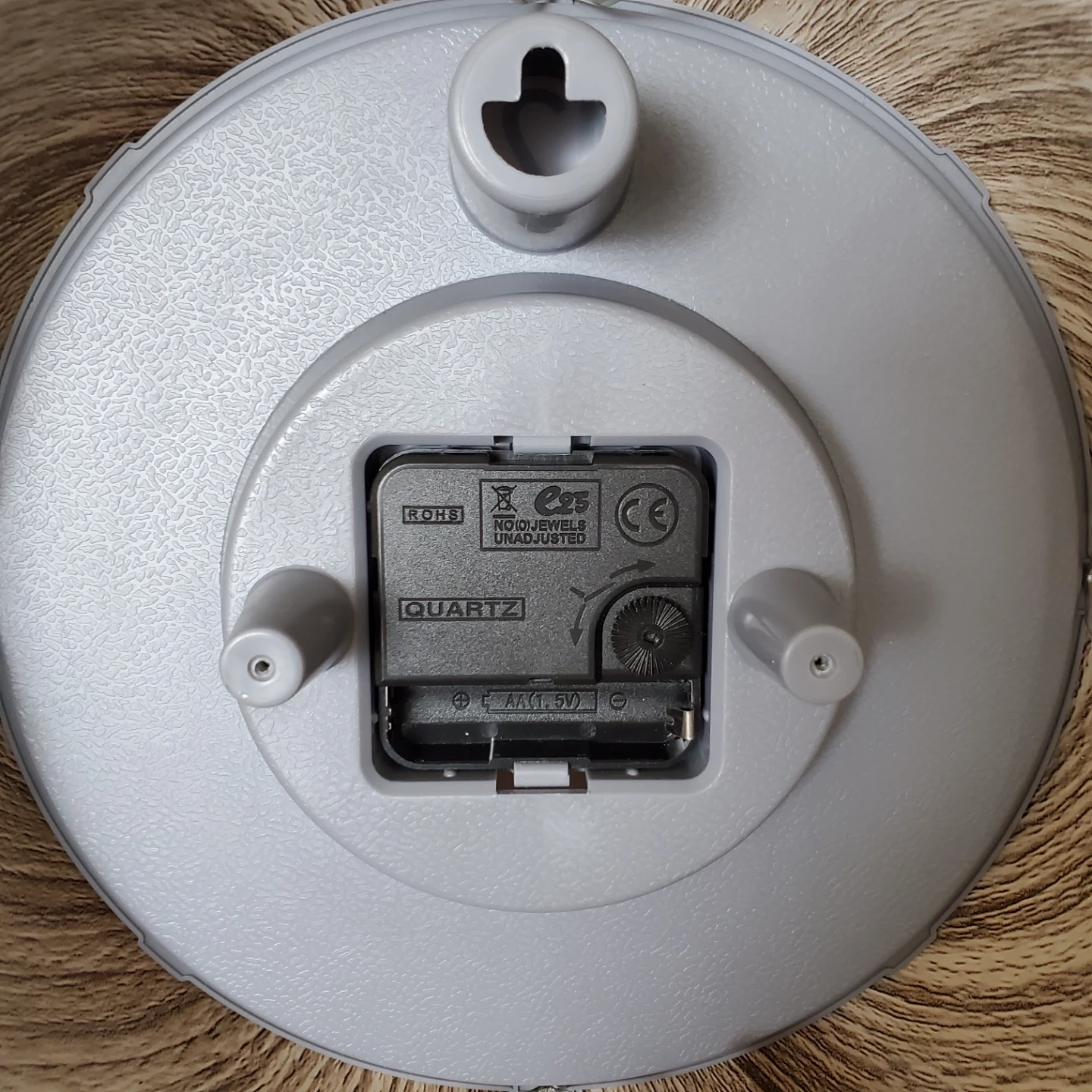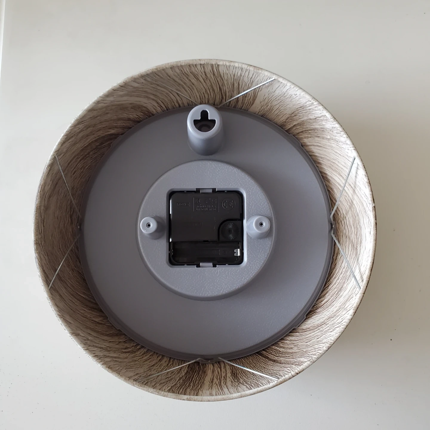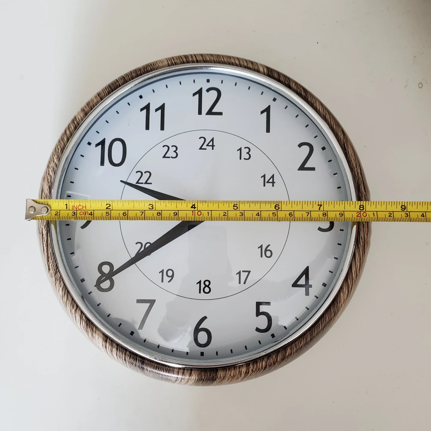 This is a quartz wall clock with wood-like grain metal frame and glass face. It measures approximately 8 inches in diameter. Powered by one AA battery.
