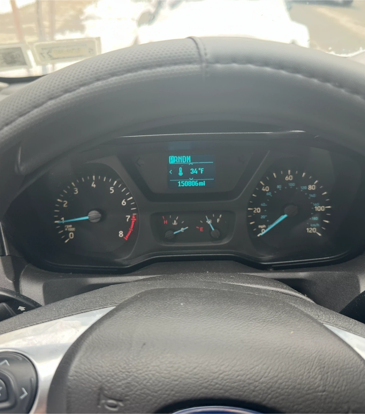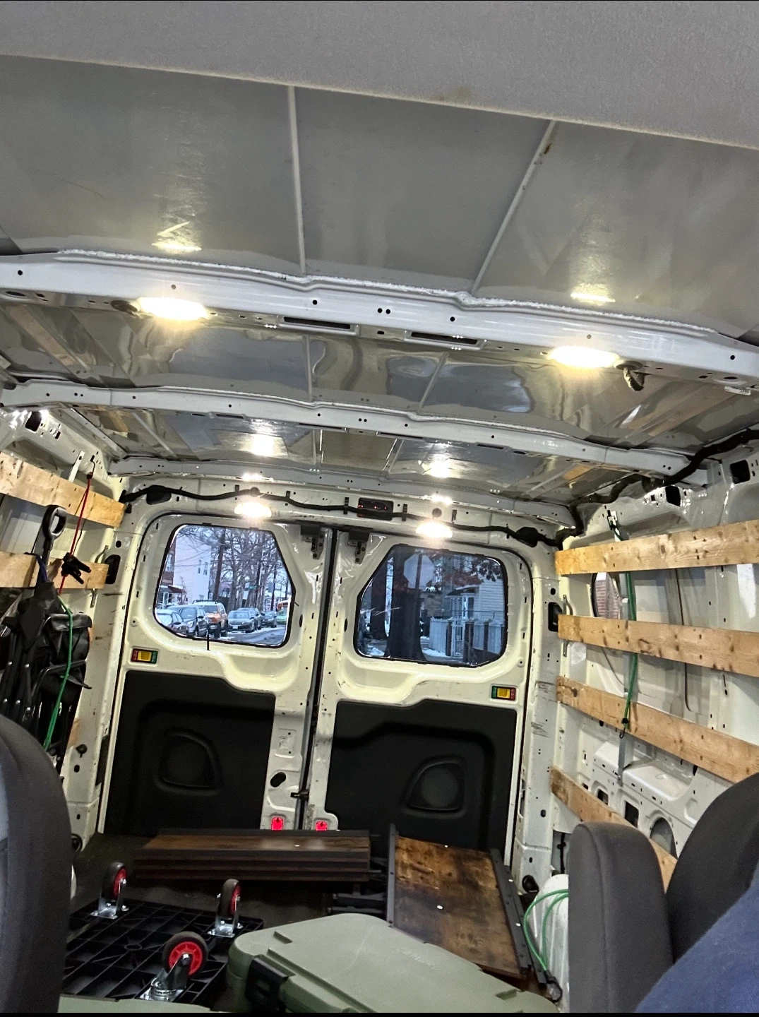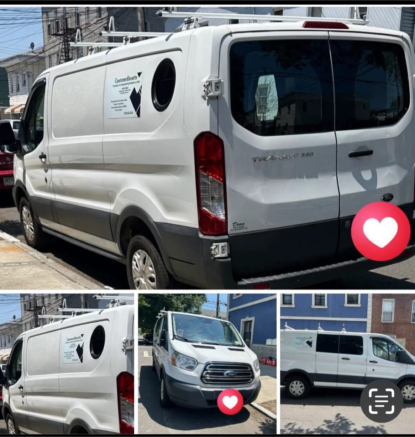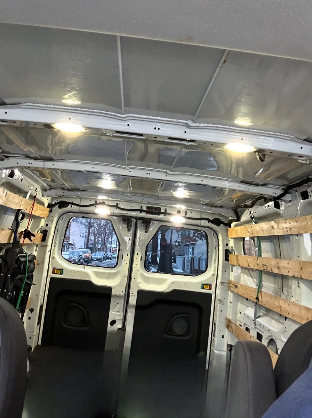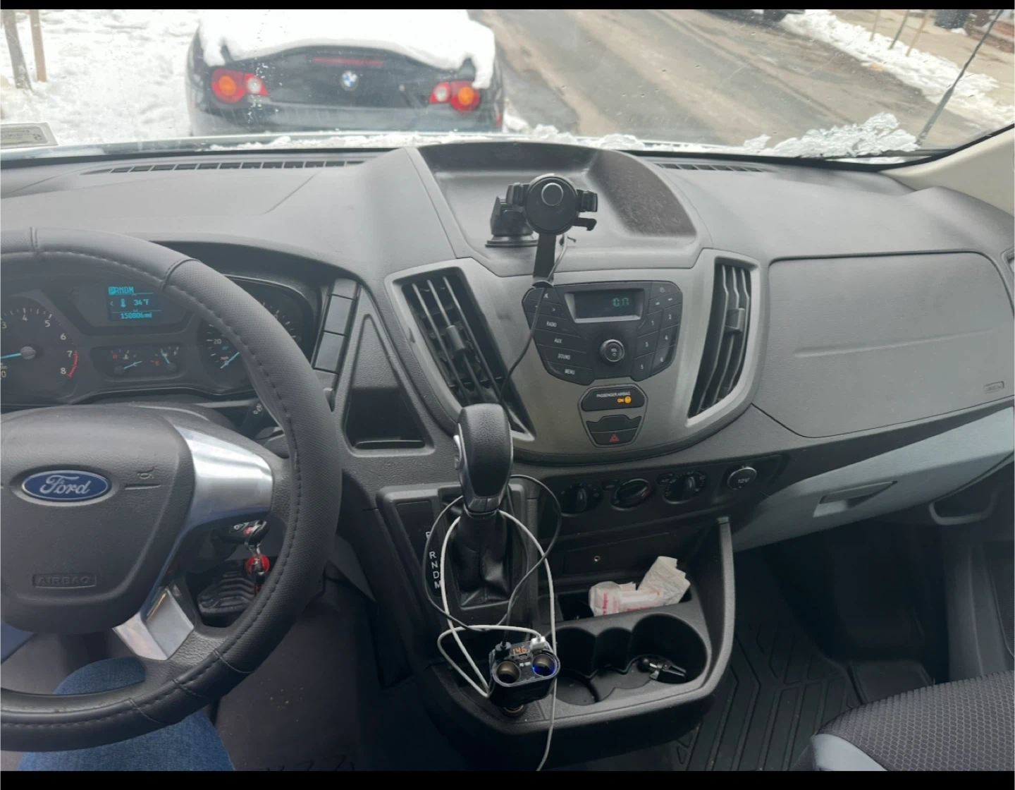 This is a 2017 Ford Transit 250 cargo van. It has 150,006 miles and runs on gasoline. The interior features shelving for storage and overhead lighting. It's ready for work!