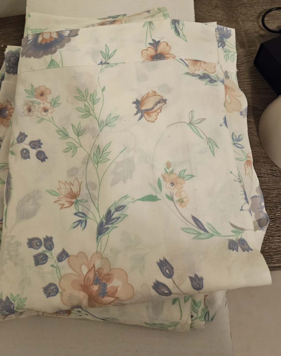 Selling this fabric with a pretty floral print. It has a cream background with blue, green, and peach flowers and leaves. Bed sheet without a pillow case.