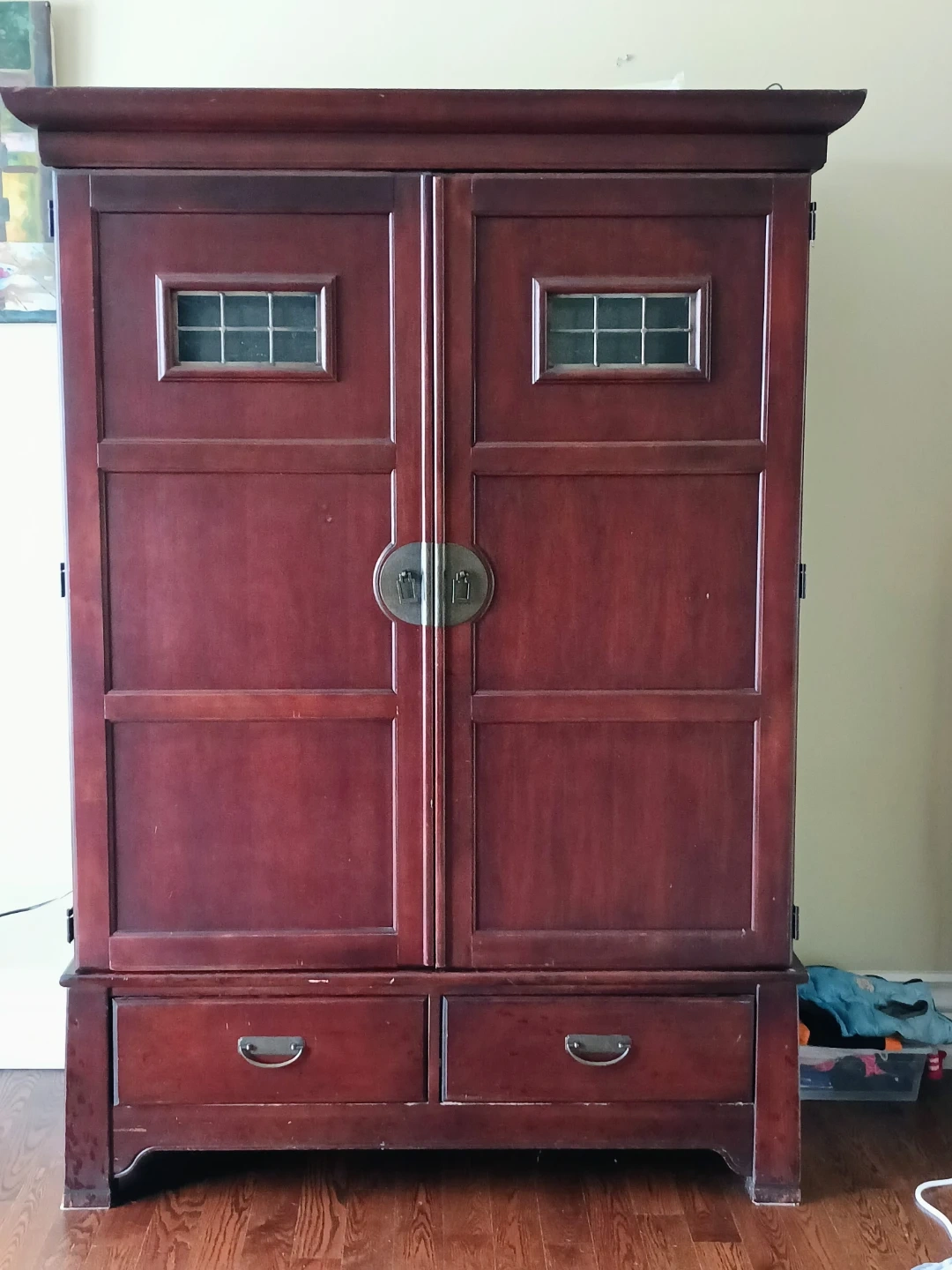 A sturdy wooden entertainment unit in a deep cherry finish. It features two doors with decorative glass inserts and two lower drawers for storage. The interior is designed to hold a television and media components.