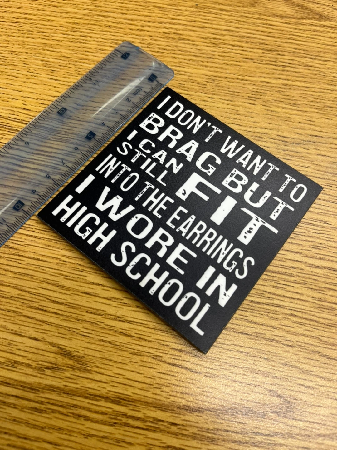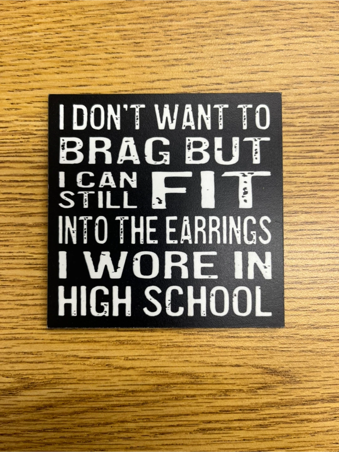 A novelty magnet featuring the humorous quote, "I DON'T WANT TO BRAG BUT I CAN STILL FIT INTO THE EARRINGS I WORE IN HIGH SCHOOL". It's printed on a black background with white text. Measures approximately 10x10cm (4x4in). Great for adding a touch of humour to your fridge or locker!