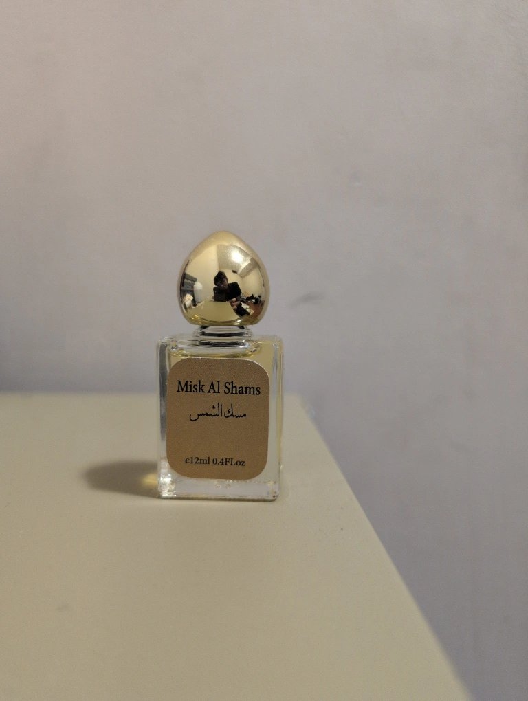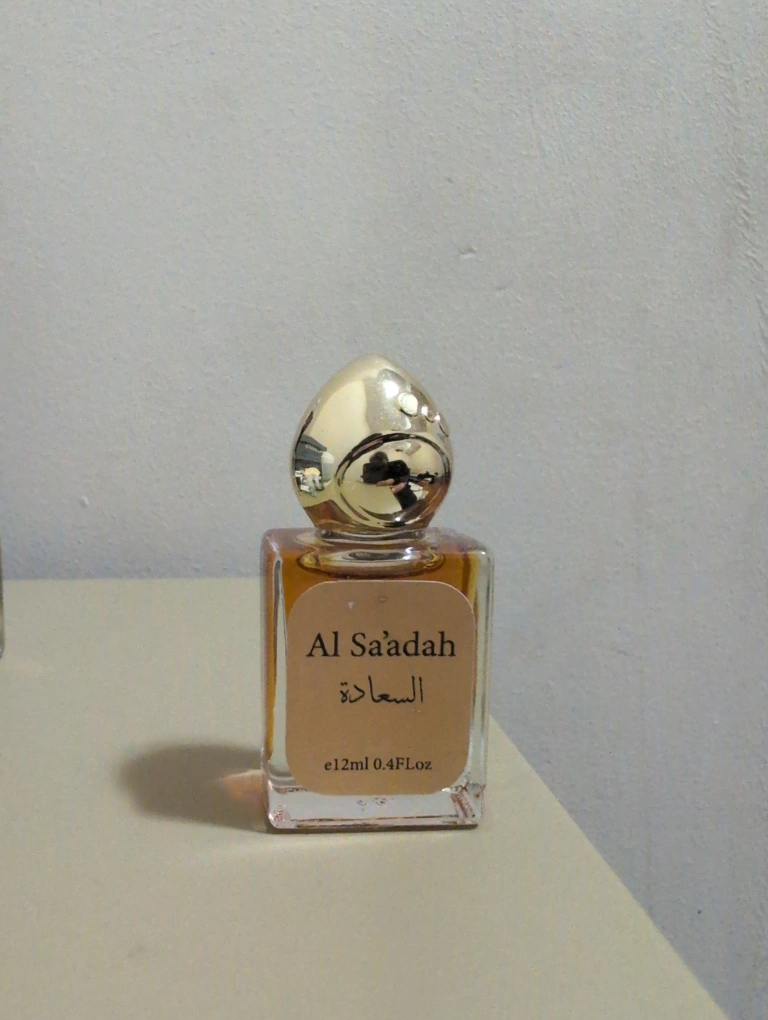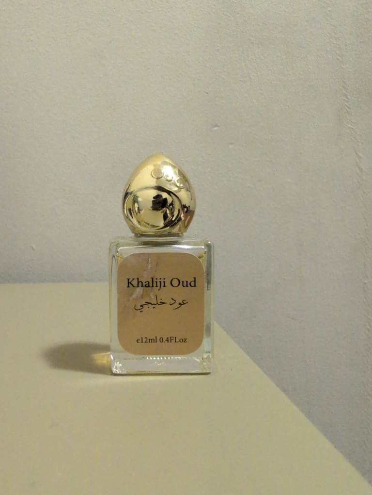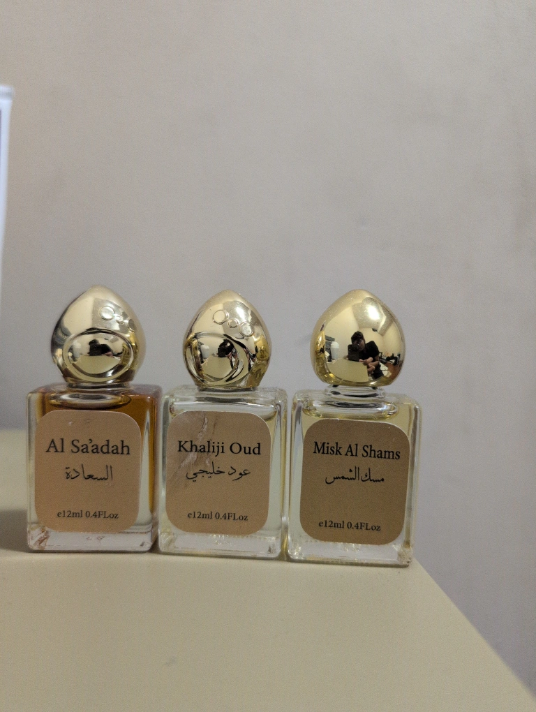 Set of three 12ml Arabian perfumes. Includes Al Saadah, Khaliji Oud, and Misk Al Shams. Small, elegant bottles with gold-coloured caps.