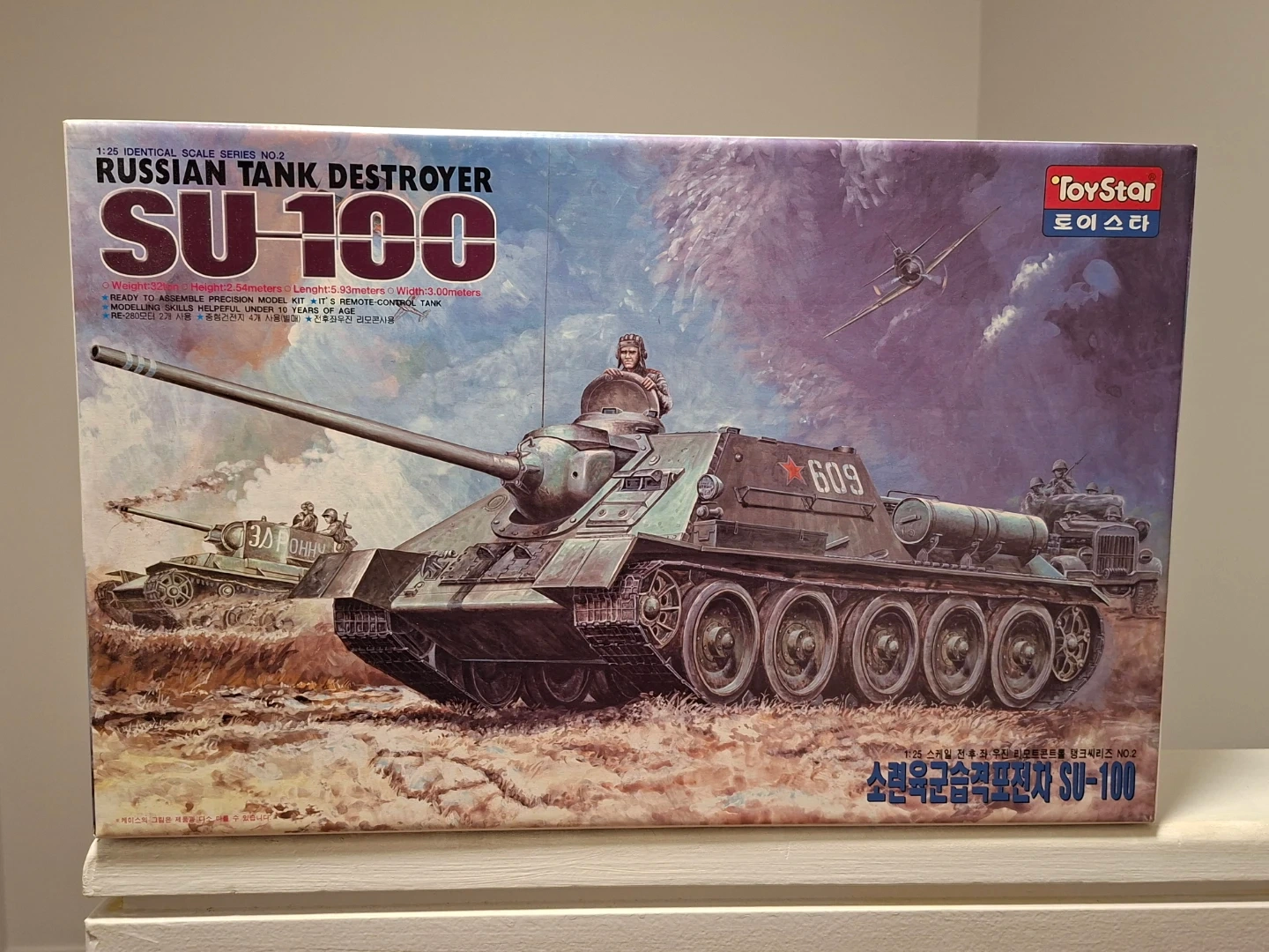 This is the ToyStar SU-100 Russian Tank Destroyer model kit in 1/25 scale. It includes all plastic parts for assembly and decals.