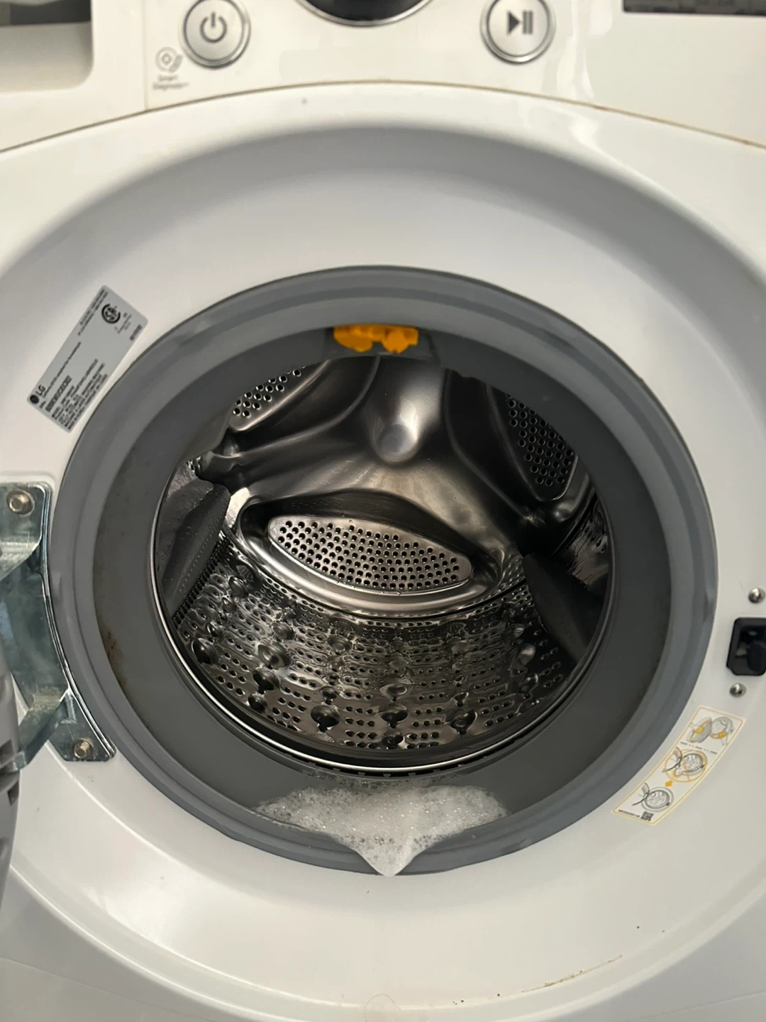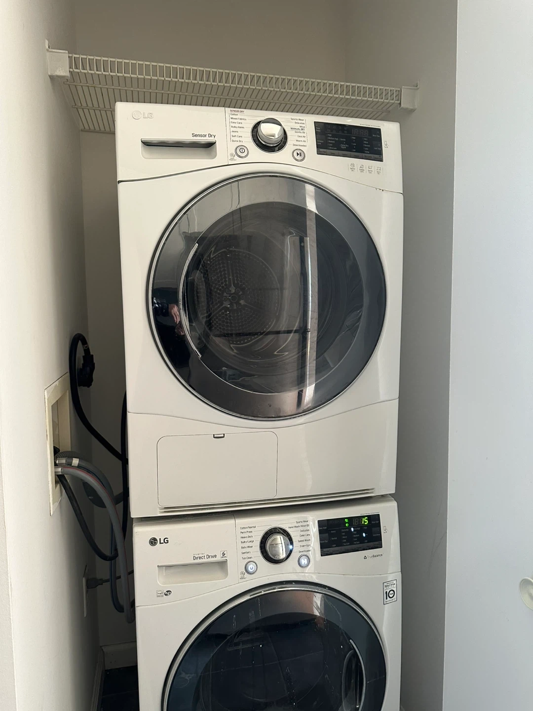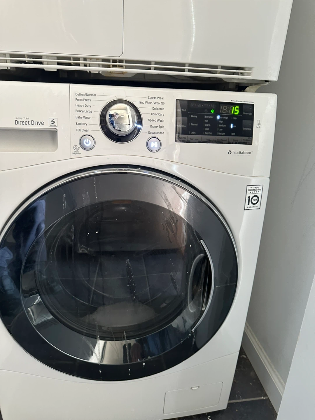 White LG stackable front load washer and dryer set. Features Inverter Direct Drive technology and Sensor Dry. Includes all necessary hoses and power cords.