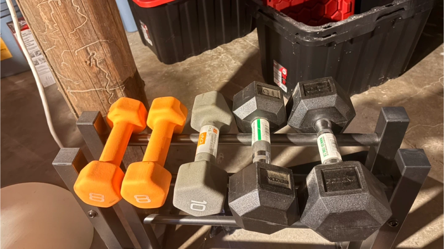 This set includes a pair of 8lb orange CAP dumbbells and a pair of 10lb grey dumbbells. Additional dumbbells are also visible in the rack. They're great for strength training at home! The hexagonal shape prevents rolling.