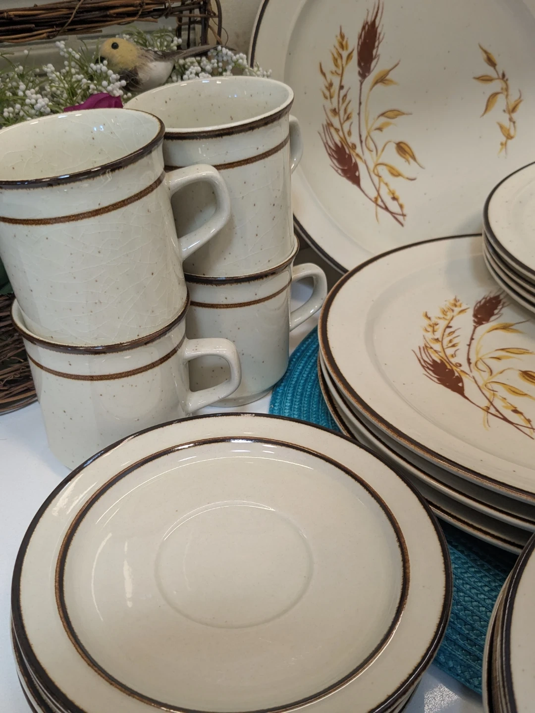 features a speckled cream base with a delicate wheat stalk design and a brown rim. It includes multiple plates, bowls, and cups, perfect for everyday use or special occasions. Add a touch of rustic charm to your table setting!