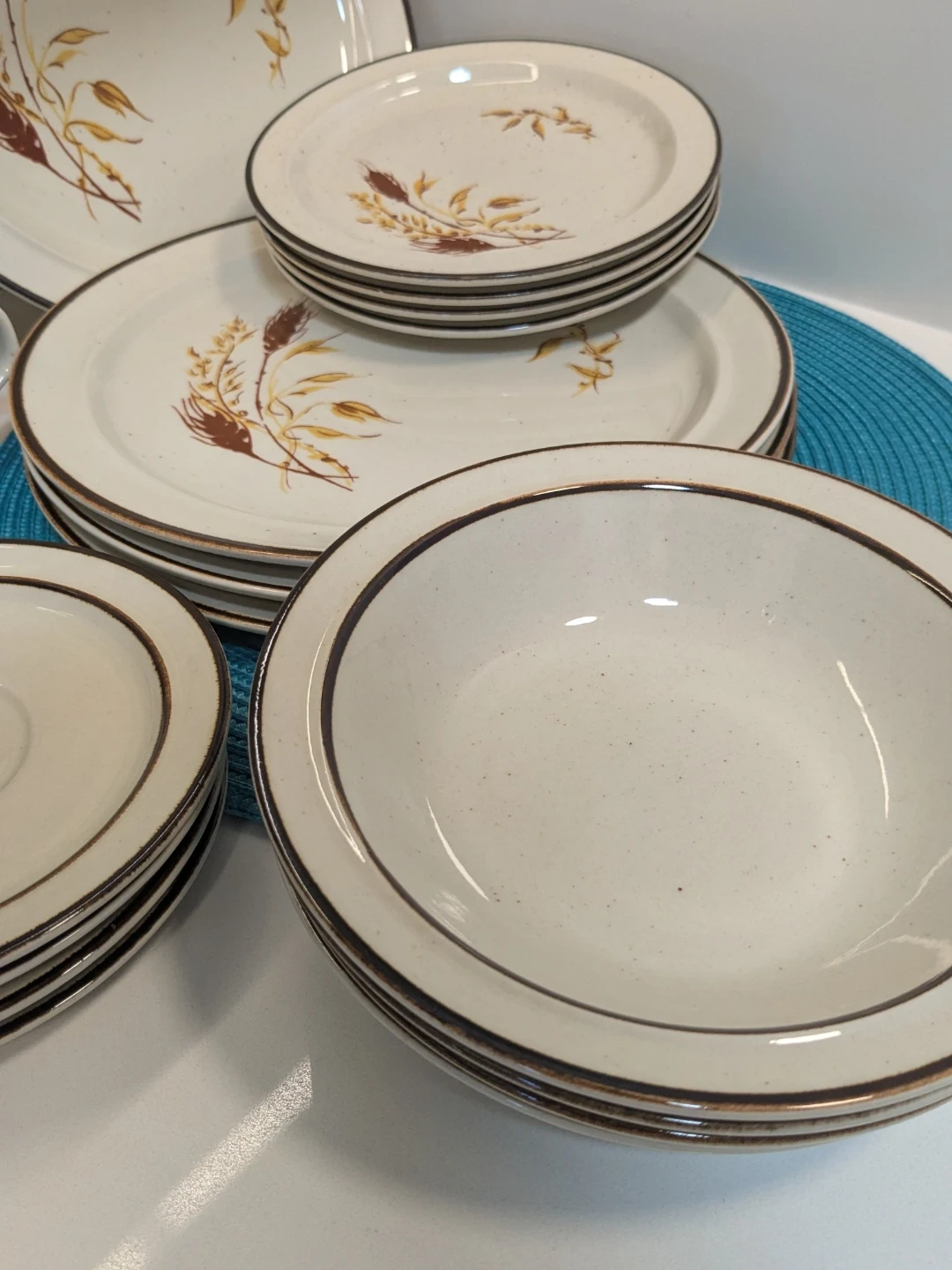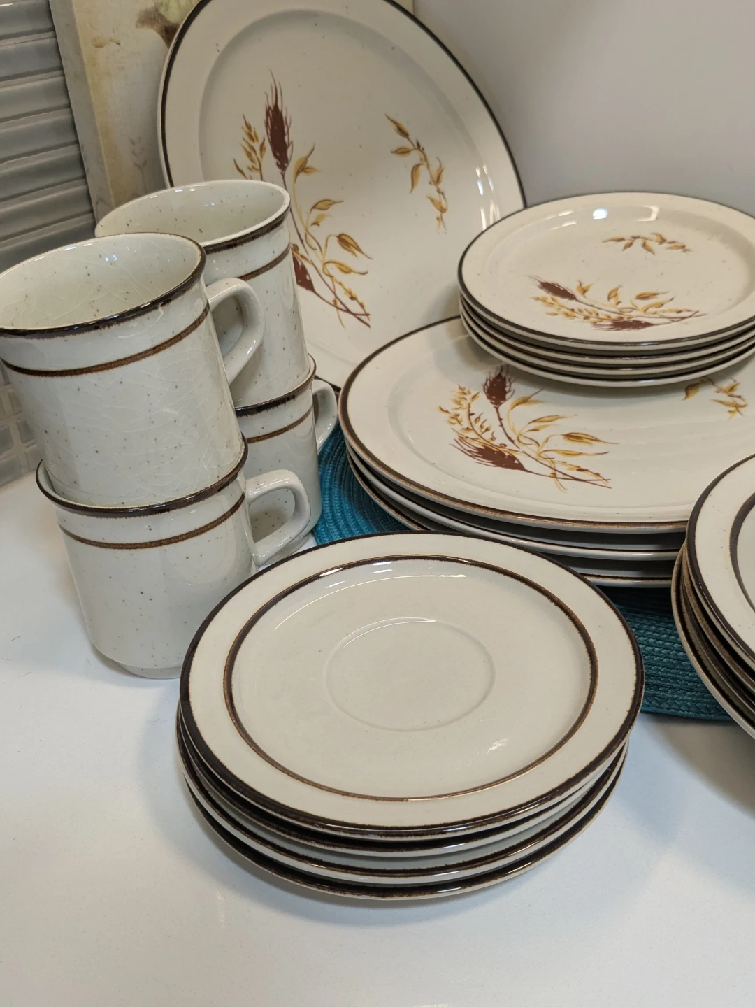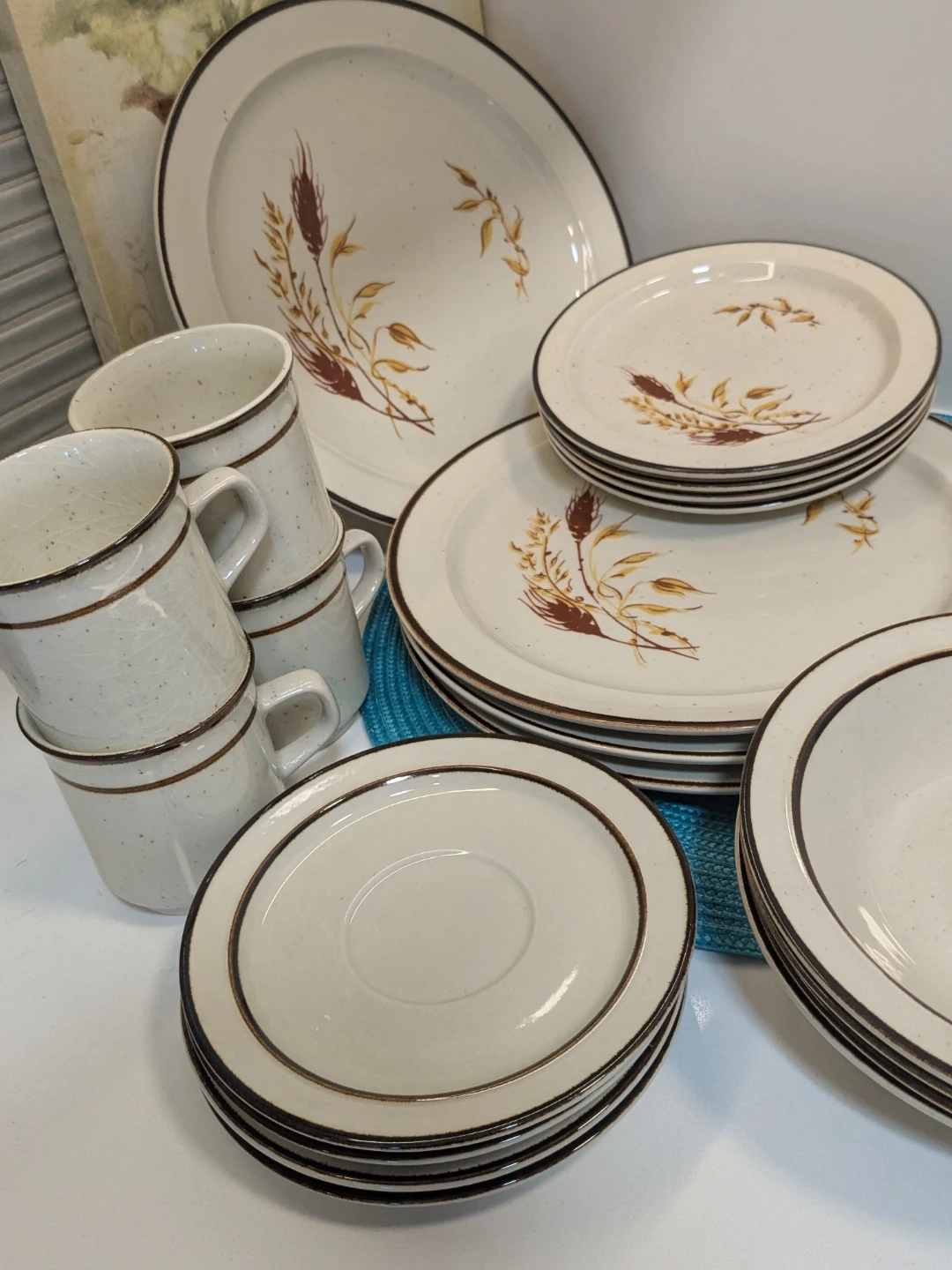 Vintage Speckled Wheat Pattern Dinnerware Setting for 4