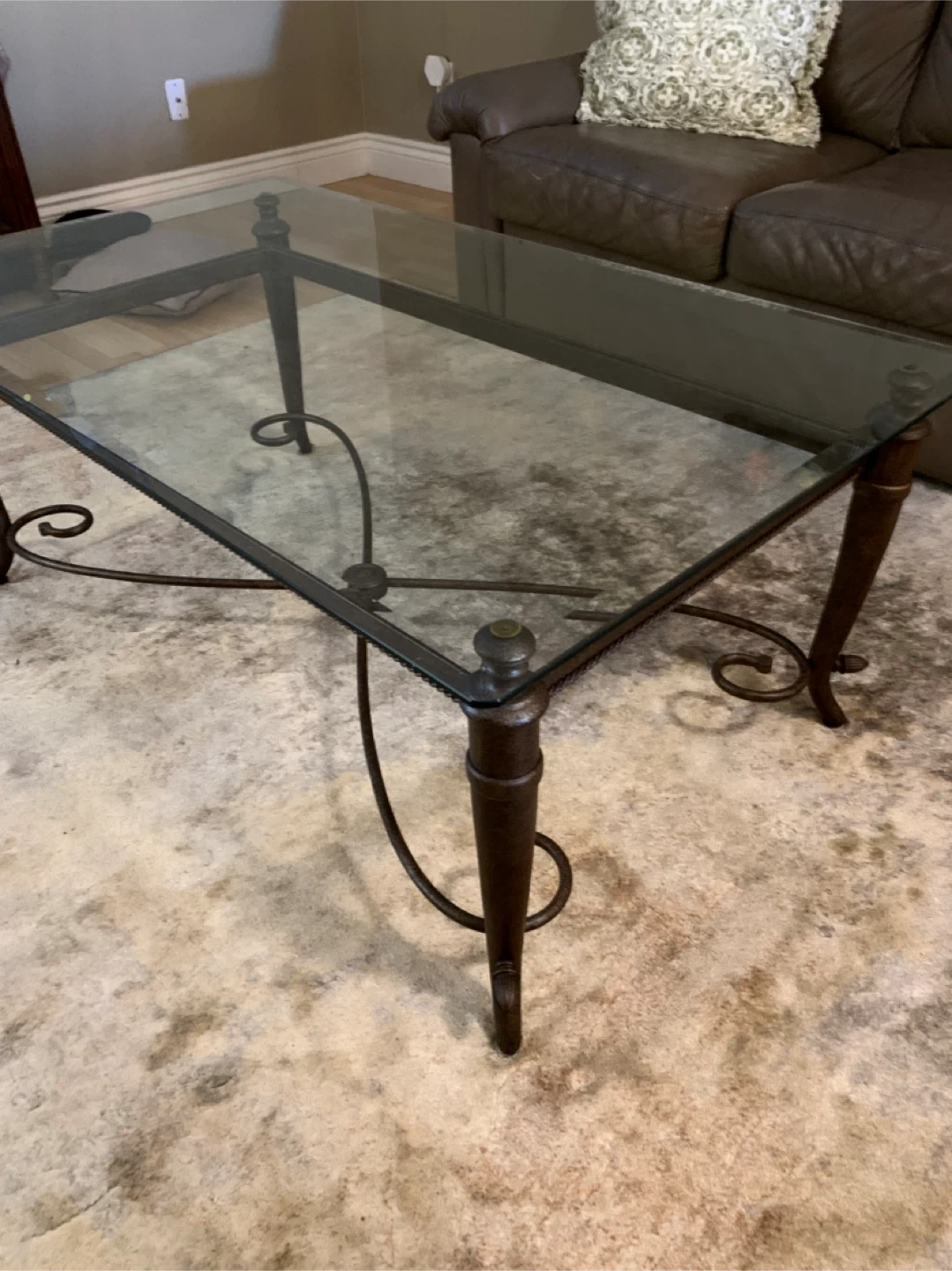 Rectangular glass top coffee table with a dark metal scroll base. It's a sturdy piece for your living room. Glass top and metal frame construction.