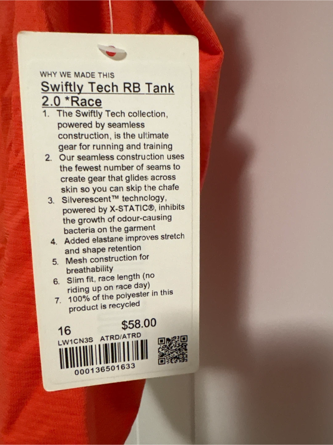 Lululemon Swiftly Tech RB Tank 2.0 Race in an orange colour. Seamless construction with Silverscent technology to inhibit odour. It's made with added elastane for stretch and shape retention, plus mesh for breathability. 100% of the polyester is recycled. New with tags.
