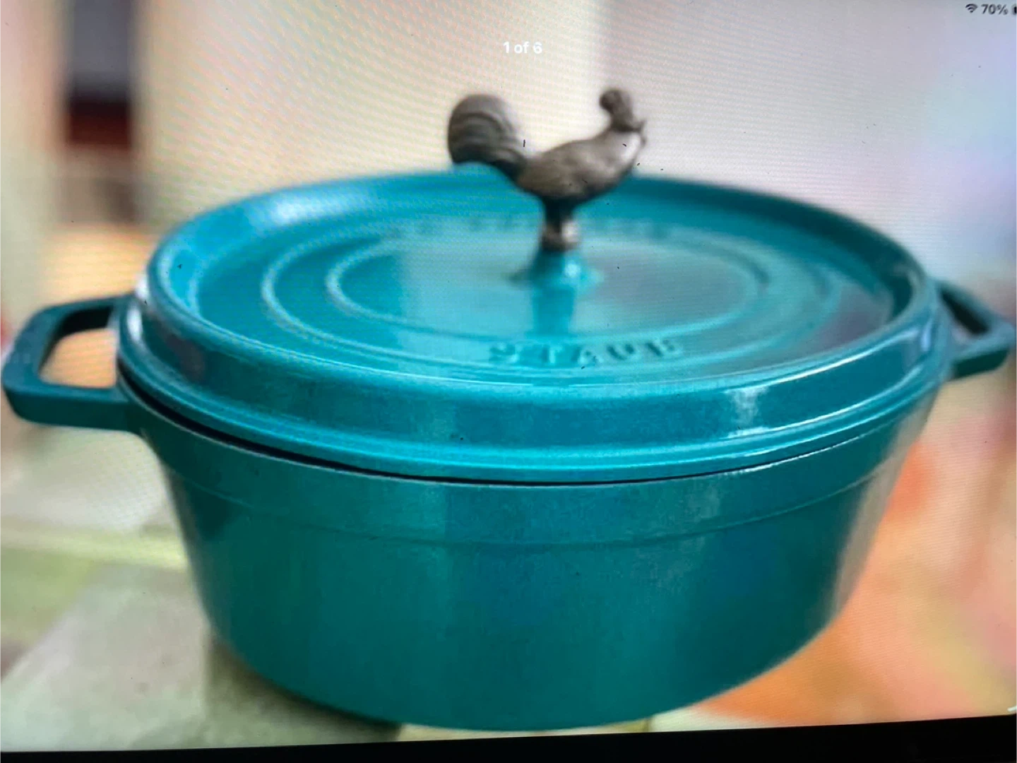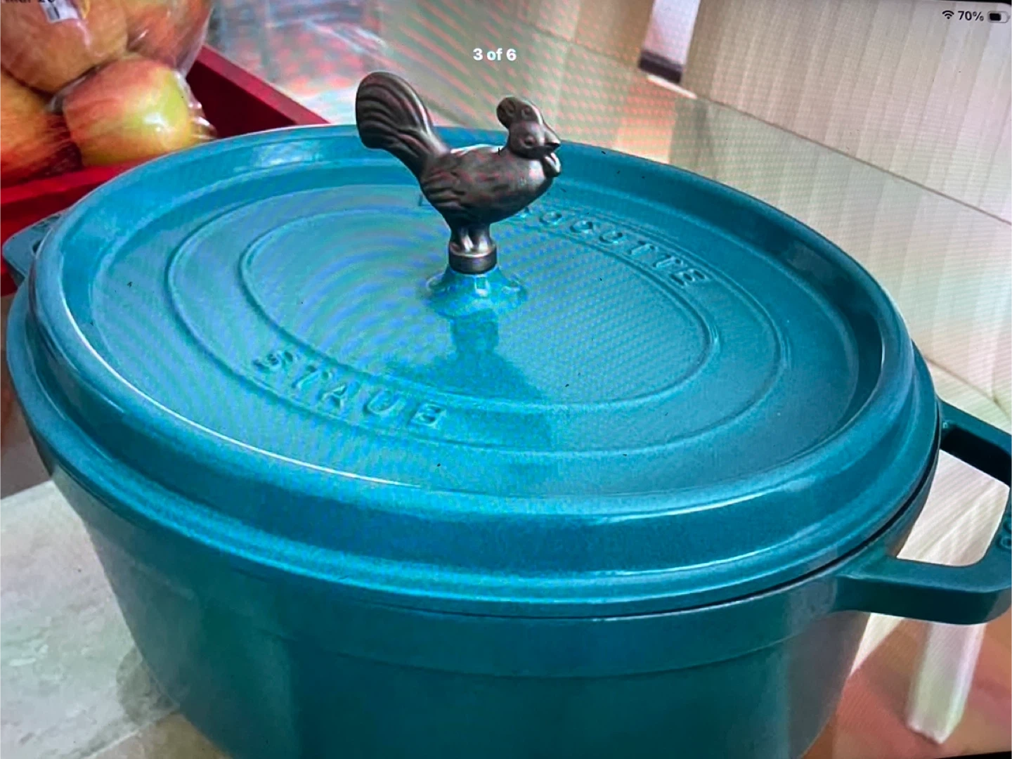 A teal Staub cast iron cocotte with a unique rooster-shaped lid pull. This piece is perfect for braising, simmering, and roasting. It's a beautiful addition to any kitchen for everyday cooking or special occasions!