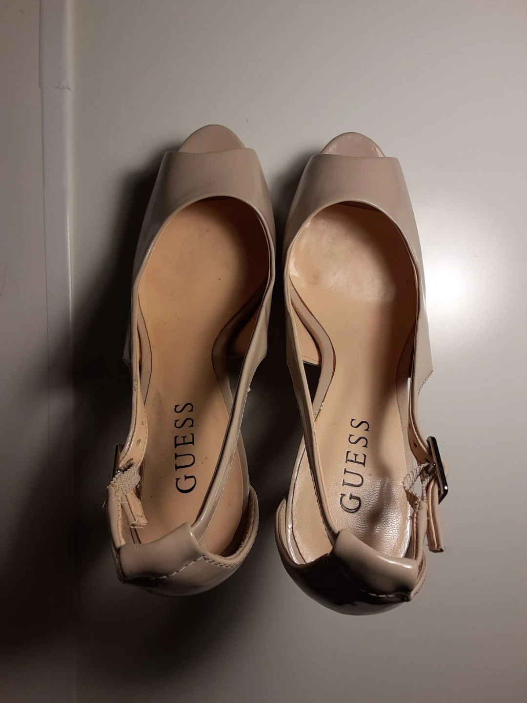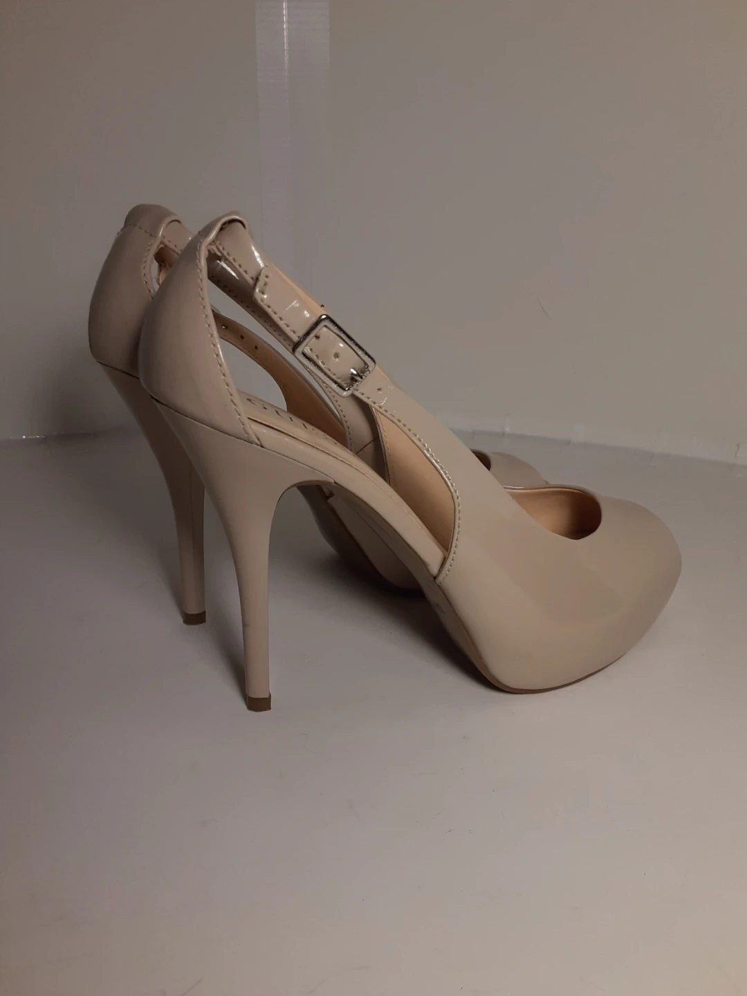 These Guess heels feature a nude patent finish with a peep toe design. They have an adjustable ankle strap and a stiletto heel. A classic choice for dressy occasions! They are in moderately used but good condition. Size 8.