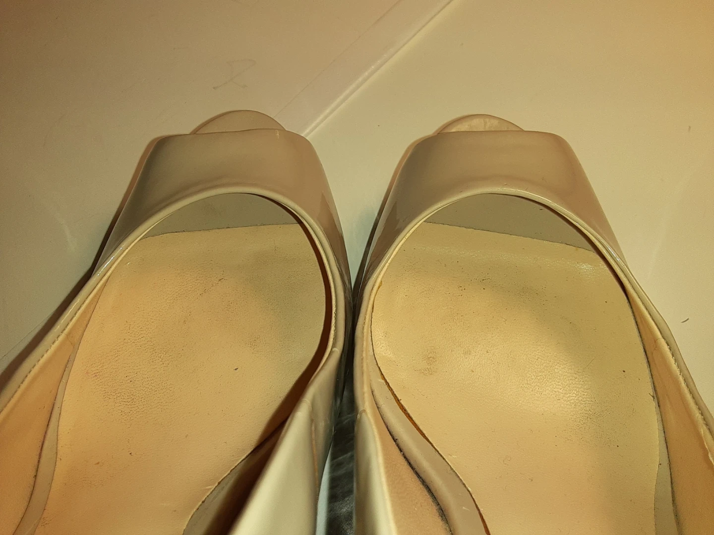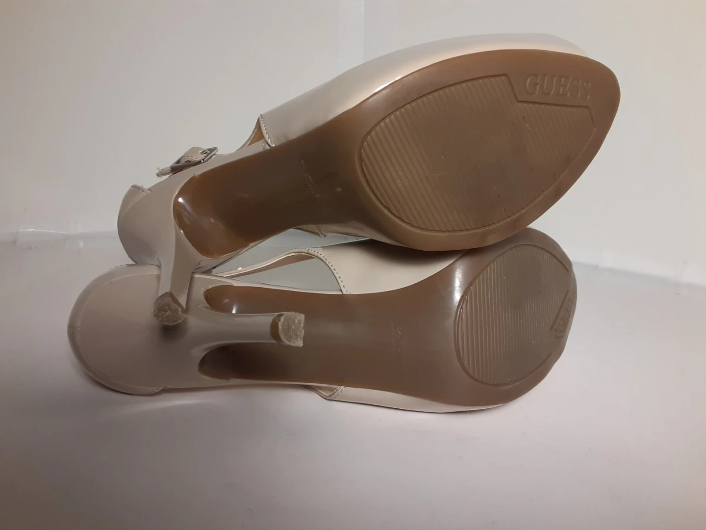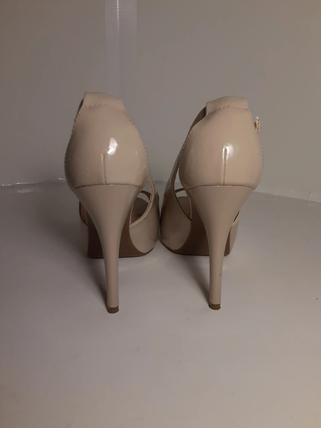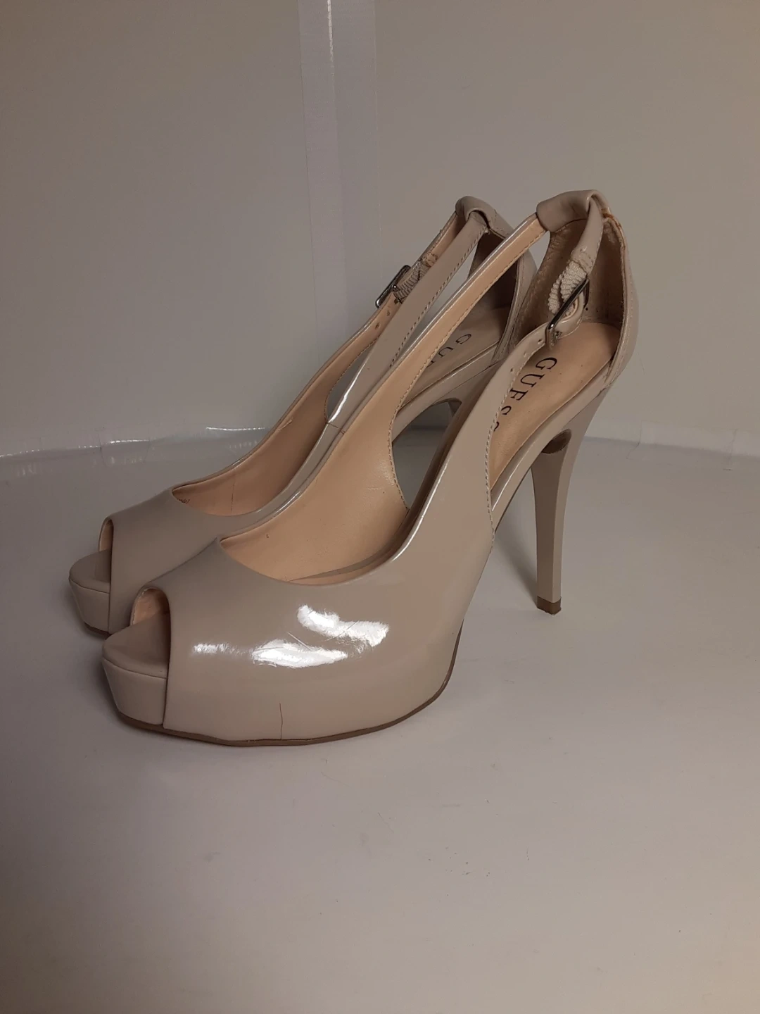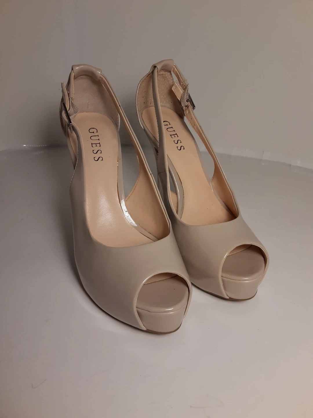 These Guess heels feature a nude patent finish with a peep toe design. They have an adjustable ankle strap and a stiletto heel. A classic choice for dressy occasions! They are in moderately used but good condition. Size 8.