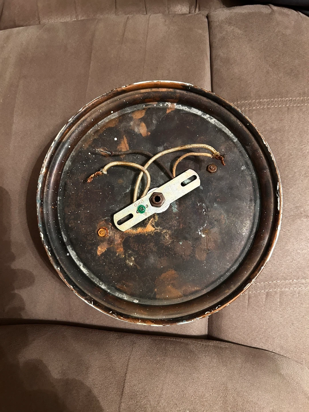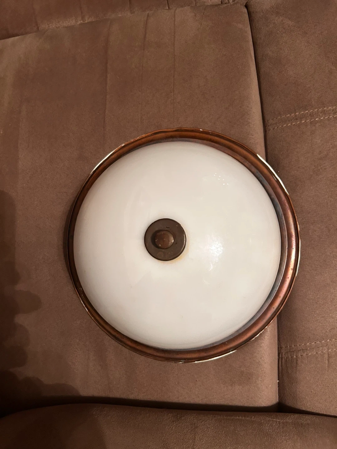 This is a flush mount ceiling light fixture with a white frosted glass shade and a copper-toned trim. It's suitable for indoor use. It has a simple, classic design that complements various room styles. This light fixture would be a good choice for hallways, bedrooms, or entryways.