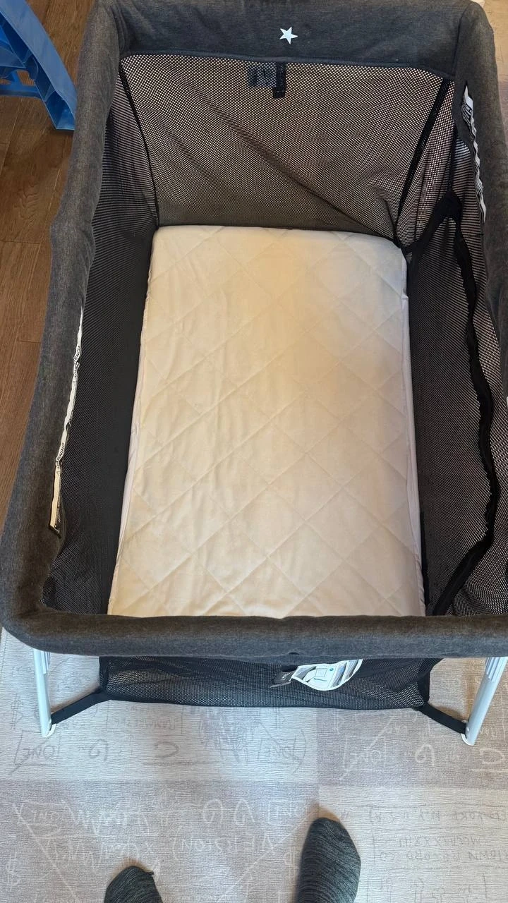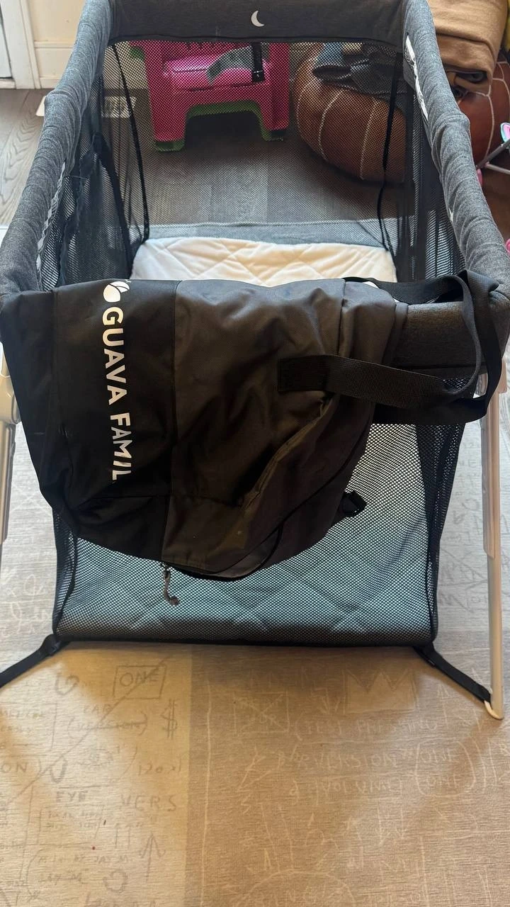 This is a Guava Family Lotus travel crib. It's a portable and lightweight option for your little one. Includes a travel bag for easy transport. Mesh sides allow for good ventilation.