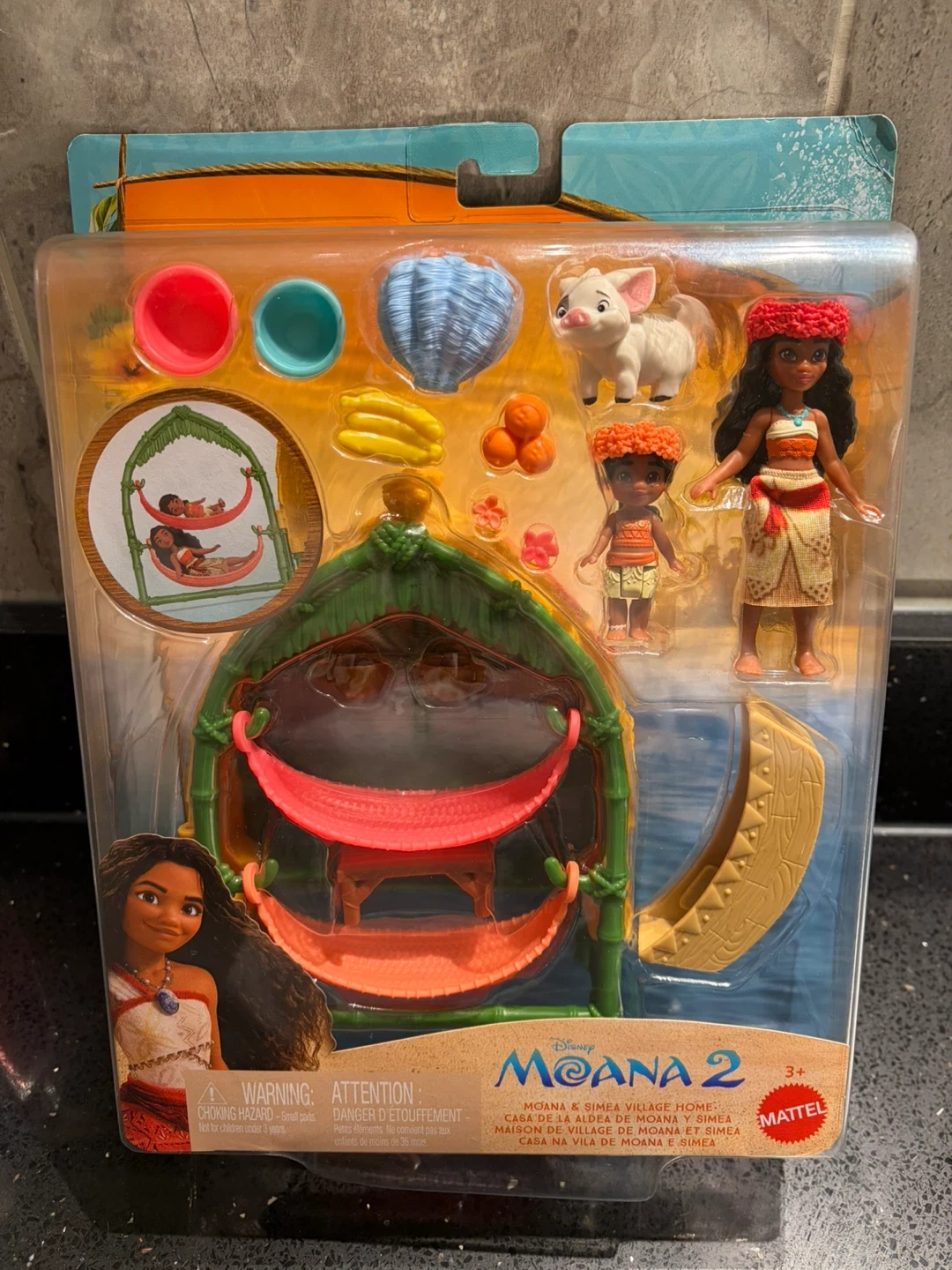 This Moana & Sima Village Home playset from Disney Moana 2 includes Moana and Sima figures, Pua the pig, a village hut, and various accessories. It's recommended for ages 3 and up. Bring the adventures of Moana to life with this fun playset!