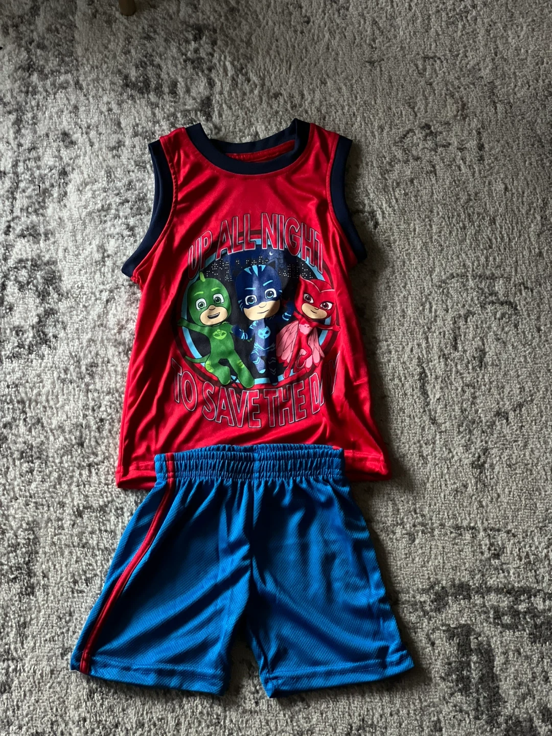 A cute PJ Masks themed set! Includes a red tank top with the PJ Masks characters and blue shorts. Perfect for a little fan! Size 2T. Never worn but no tags received as a gift