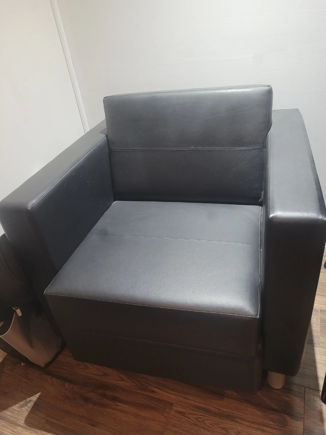 This is a single black accent chair is great for waiting rooms or contemporary spaces. It features a modern design with clean lines. The seat and back cushions are integrated for a seamless look. This chair's compact size makes it a versatile seating option for various spaces.
