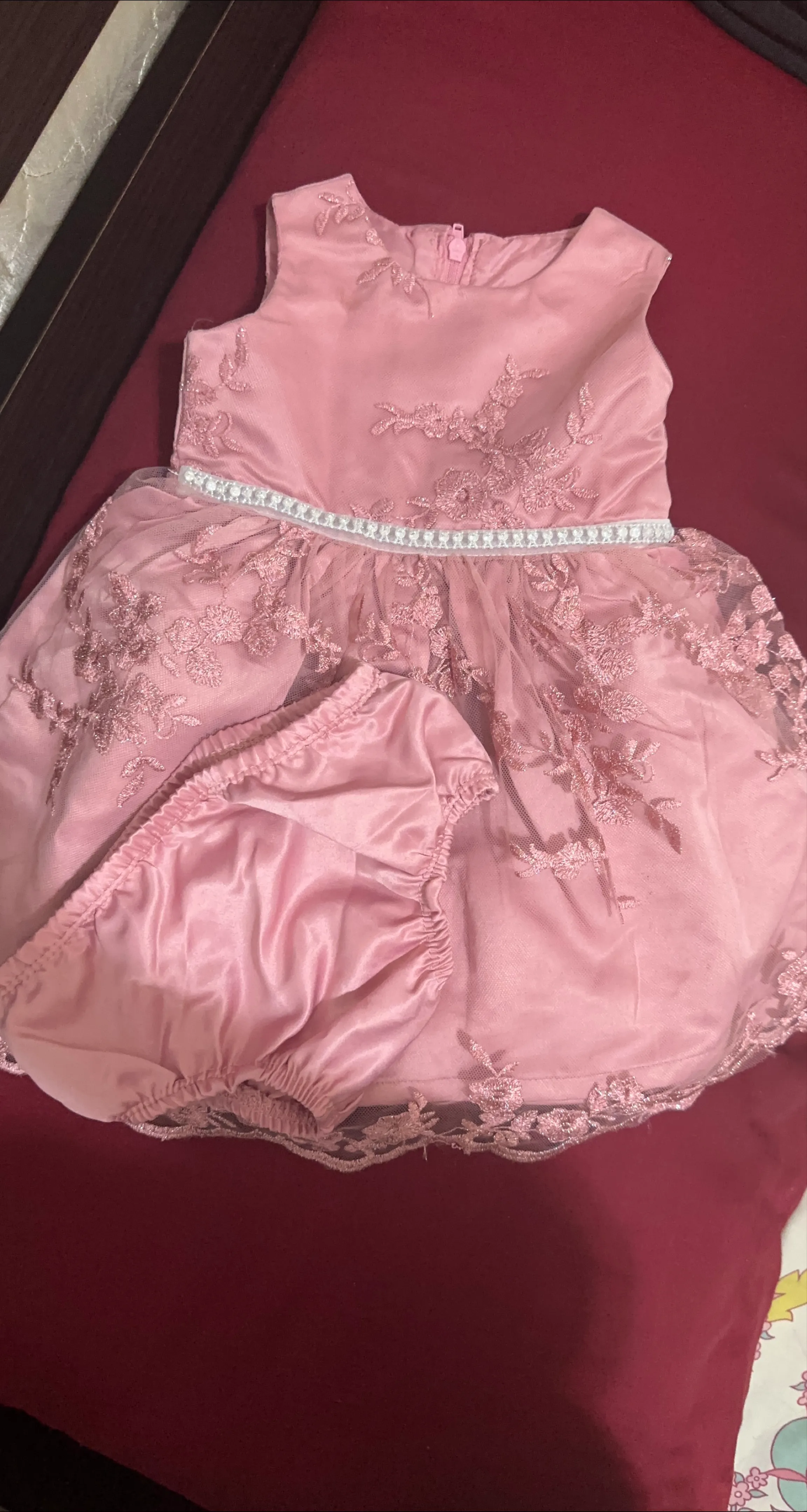 A beautiful pink baby dress 6-9 months with delicate floral embroidery and a matching bloomer. Perfect for a special occasion or a cute everyday outfit! The dress has a sweet, classic design.