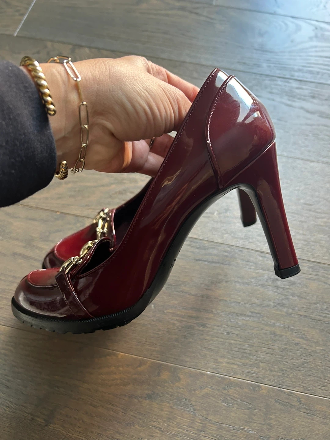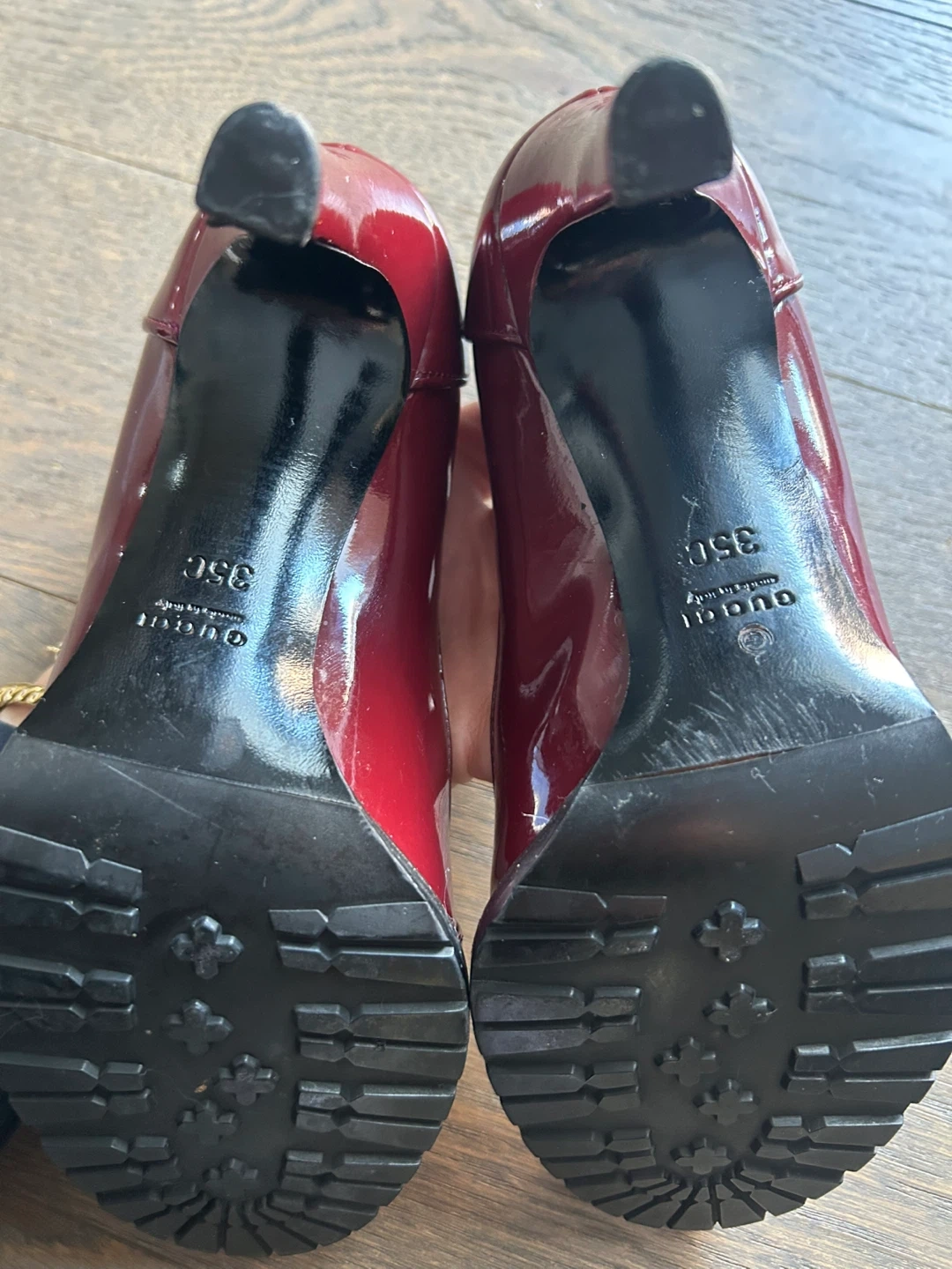 Gorgeous Gucci heels in a rich red patent leather. These shoes feature the iconic horsebit detail and a sturdy lug sole. Size 35.