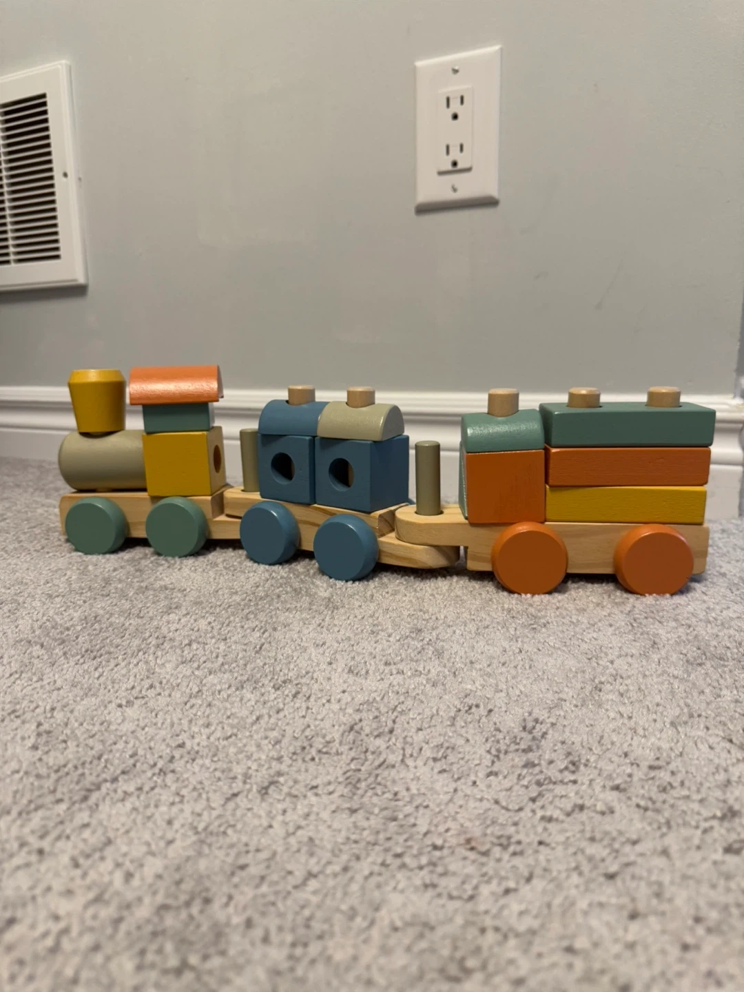 Selling a cute wooden train toy! It's in great condition and perfect for little ones who love trains. The colours are bright and cheerful, and it's made of sturdy wood. Would be a great addition to any playroom!