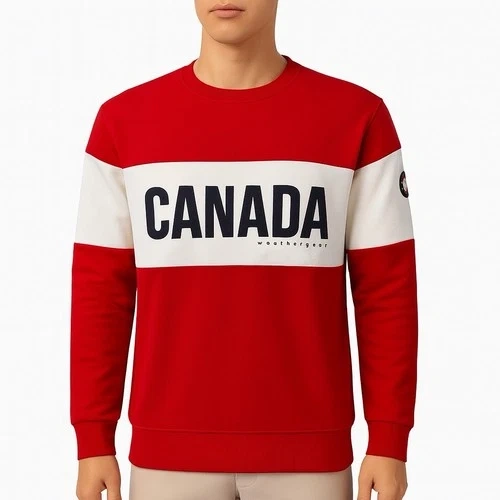 Show your Canadian pride with this stylish Canada WeatherGear men’s sweatshirt featuring a bold CANADA chest graphic and clean red/white colorblock design.