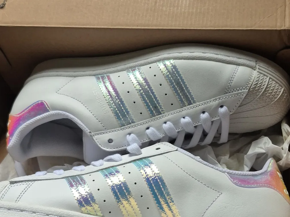 Selling a pair of Adidas Superstar J sneakers in white with iridescent stripes and heel detail. They are in brand new condition and come with the original box.