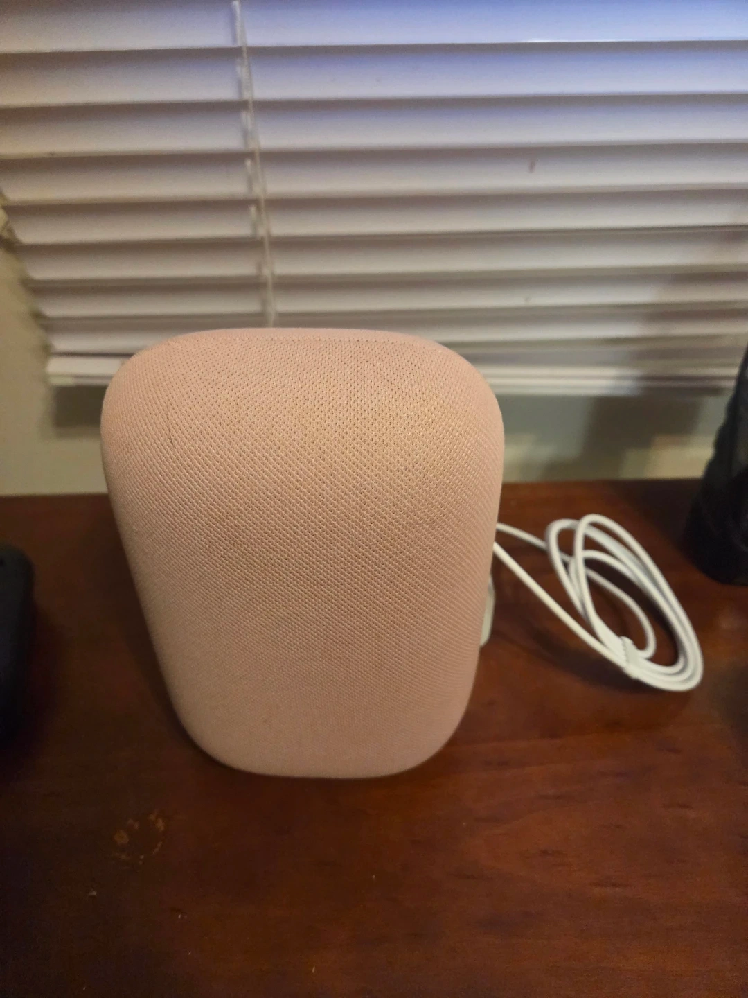 It's a pink Google Nest smart speaker. It comes with its power cable. This speaker's compact design makes it easy to place anywhere.