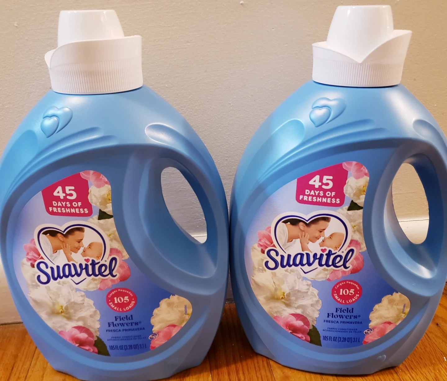 Suavitel Field Flowers Fresca Primavera fabric conditioner. Each bottle contains 105 fl oz (3.28 qt) 3.1 L and promises 45 days of freshness