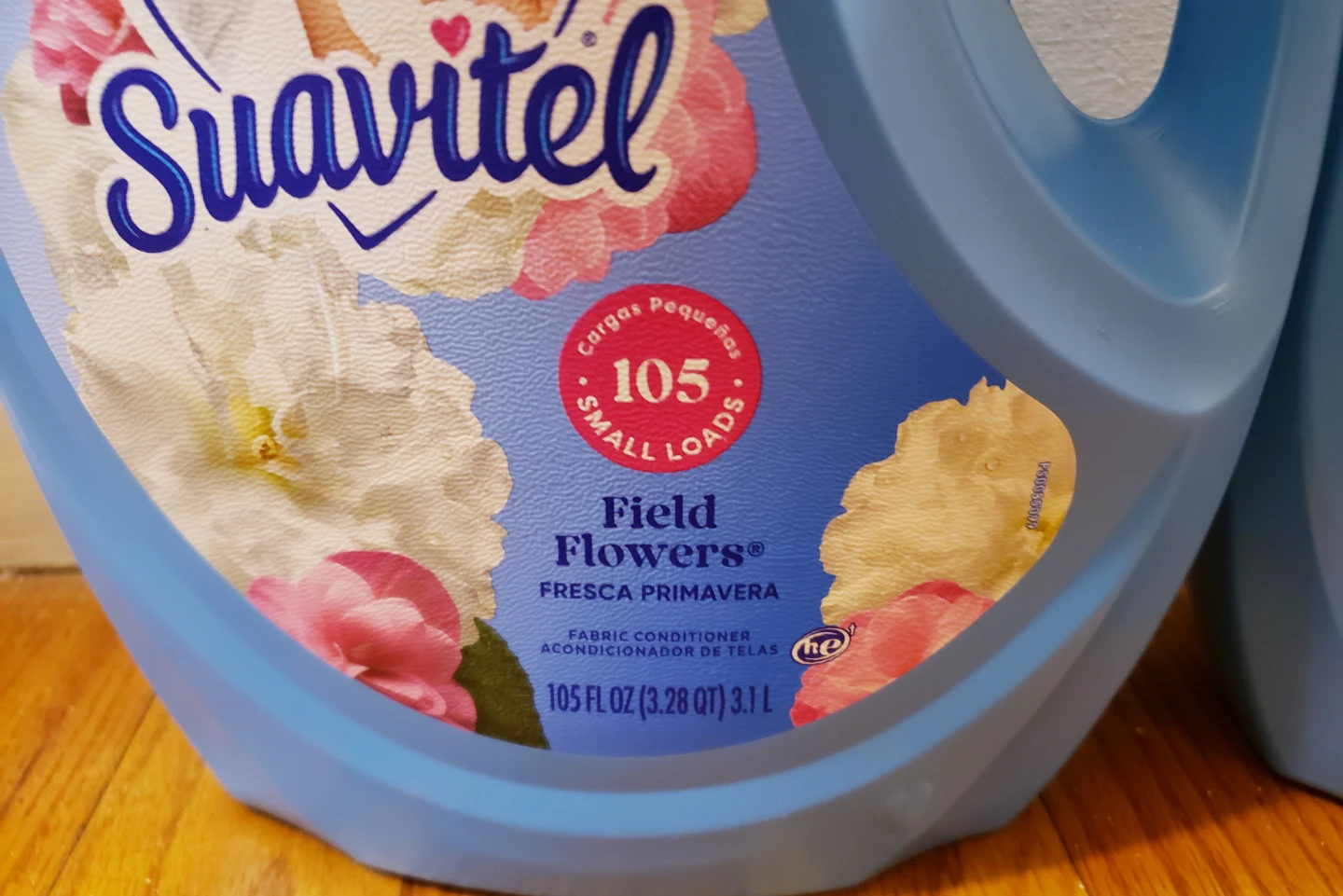 Suavitel Field Flowers Fresca Primavera fabric conditioner. Each bottle contains 105 fl oz (3.28 qt) 3.1 L and promises 45 days of freshness