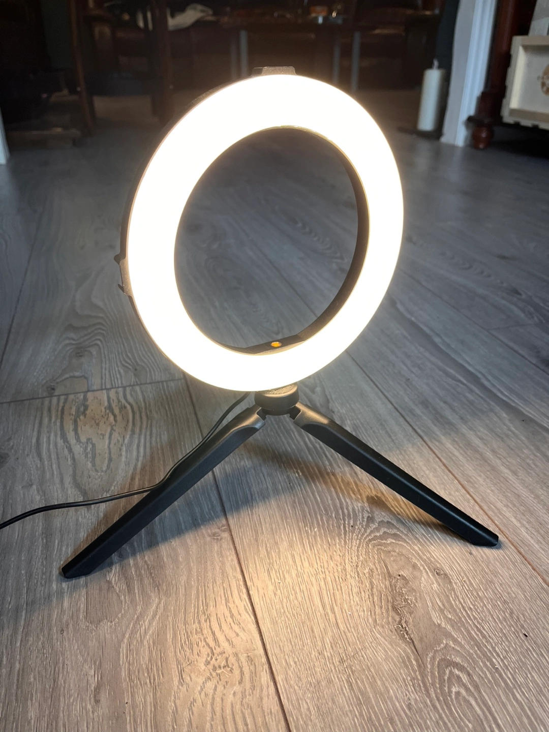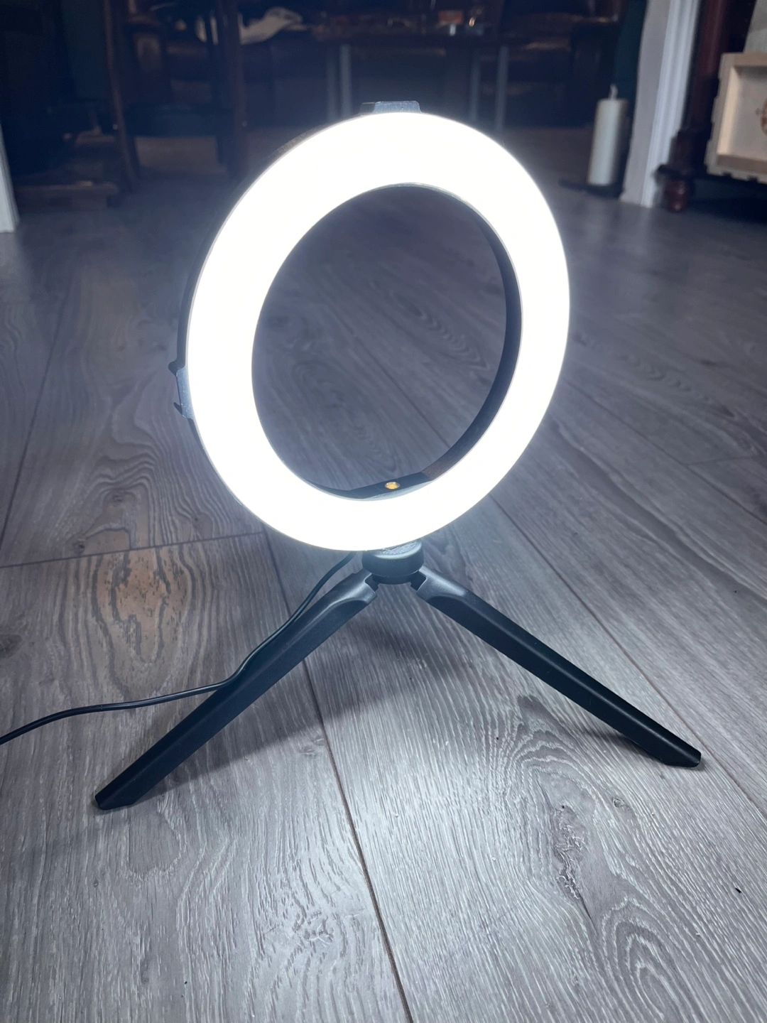 Selling a handy LED ring light that comes with its own tripod stand! It's perfect for adding some extra light for video calls, photos, or just brightening up your space. Great condition and ready for a new home