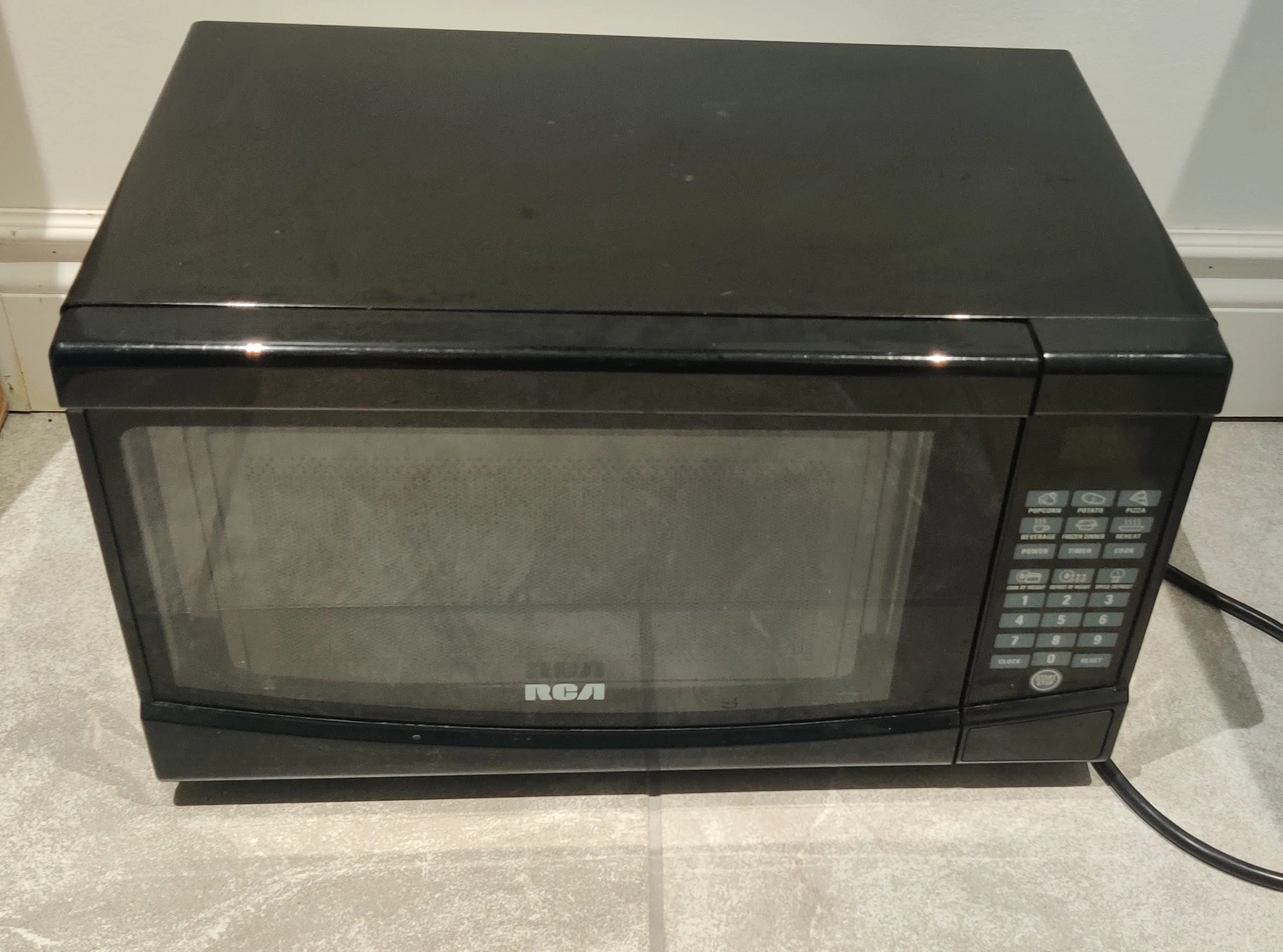 Selling a black RCA microwave oven. It's in good working condition and ready to heat up your meals! Perfect for small kitchens or office spaces. It's a reliable and simple to use microwave. Has little stains.