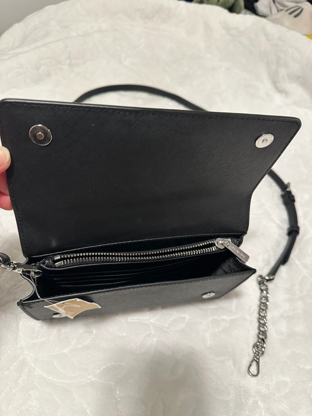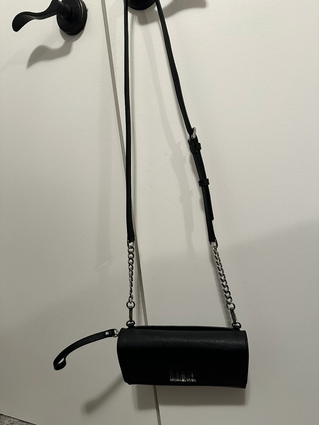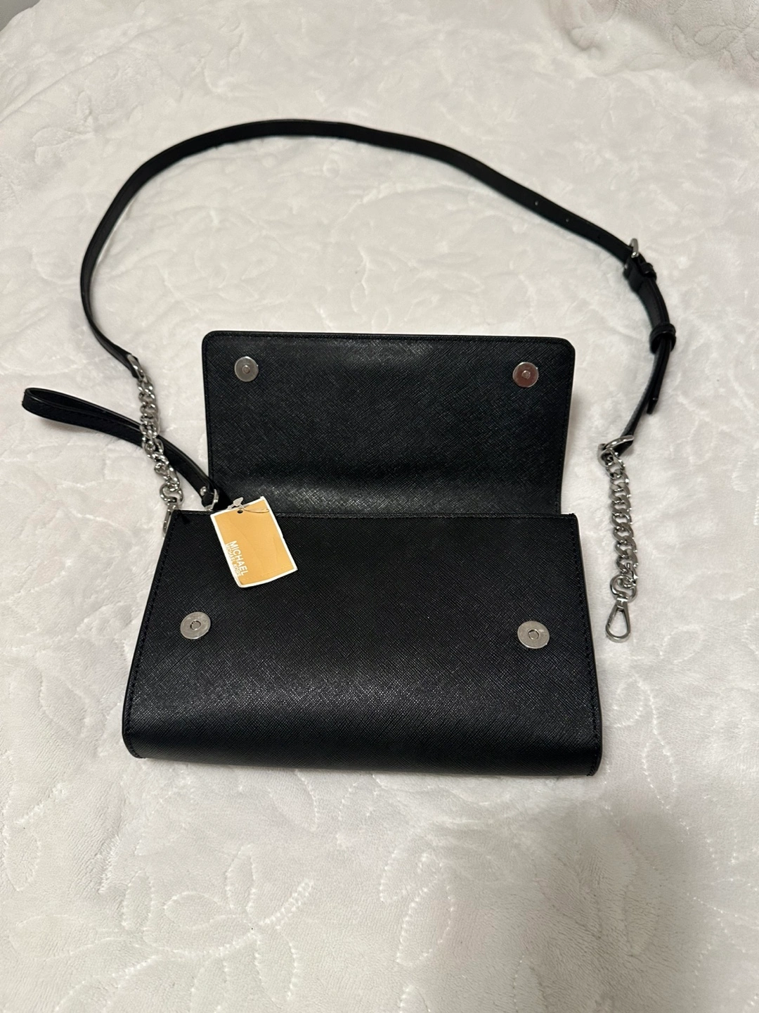 Black crossbody bag with chain strap and matching wallet. The wallet has a wrist strap.