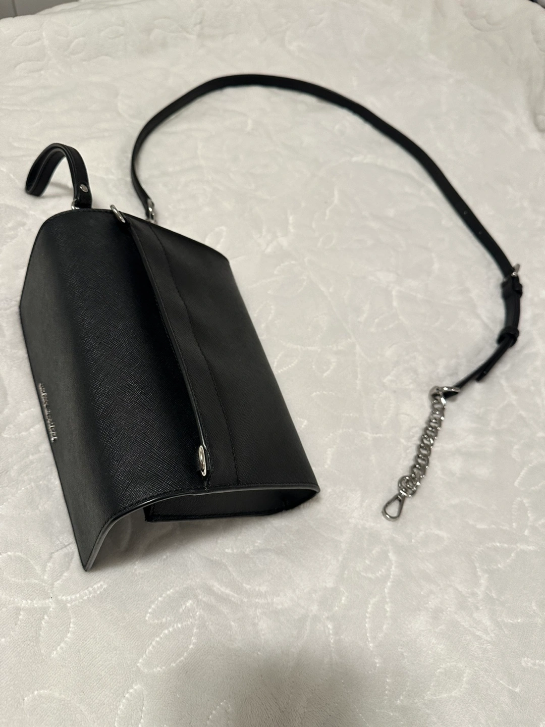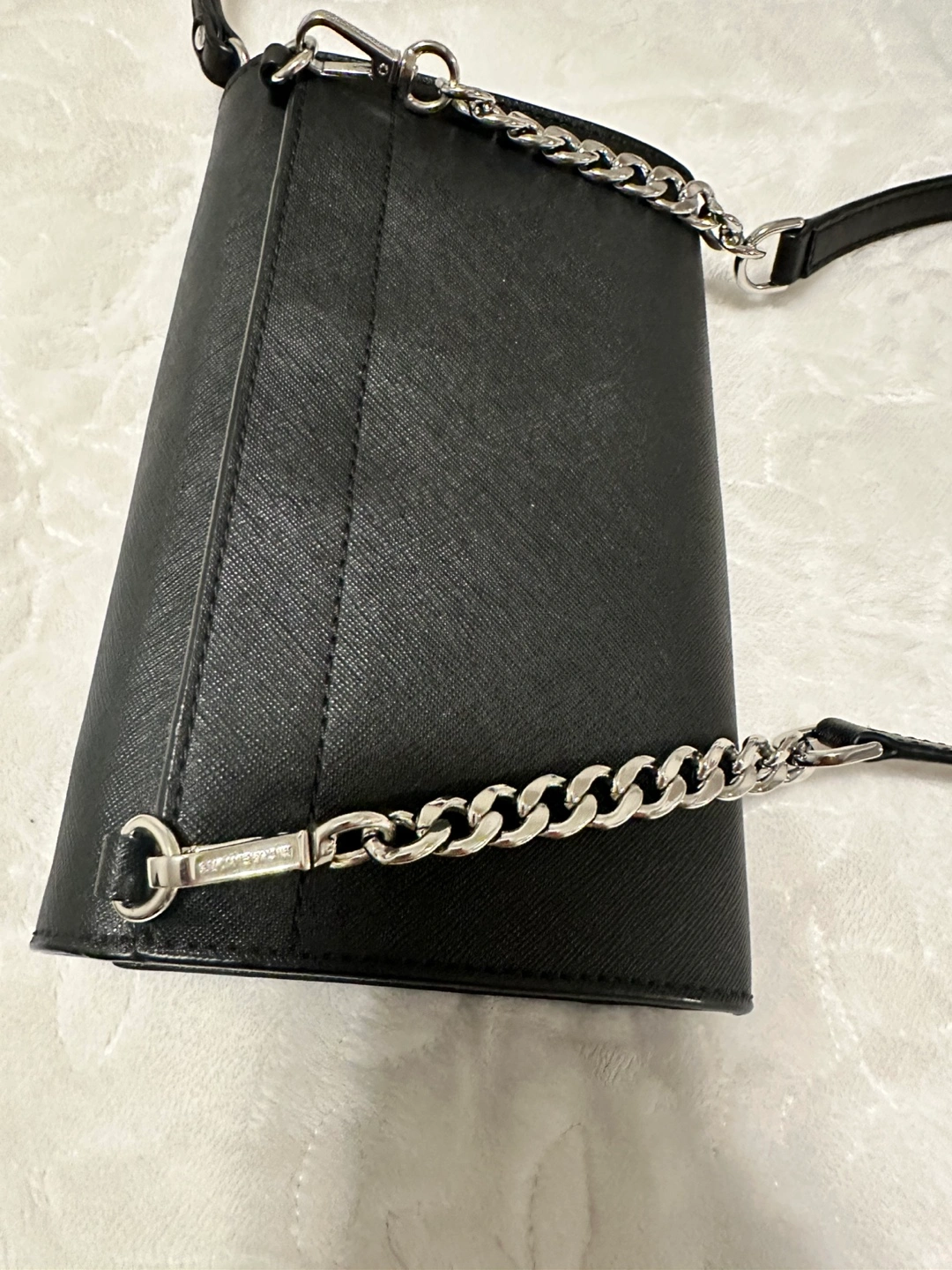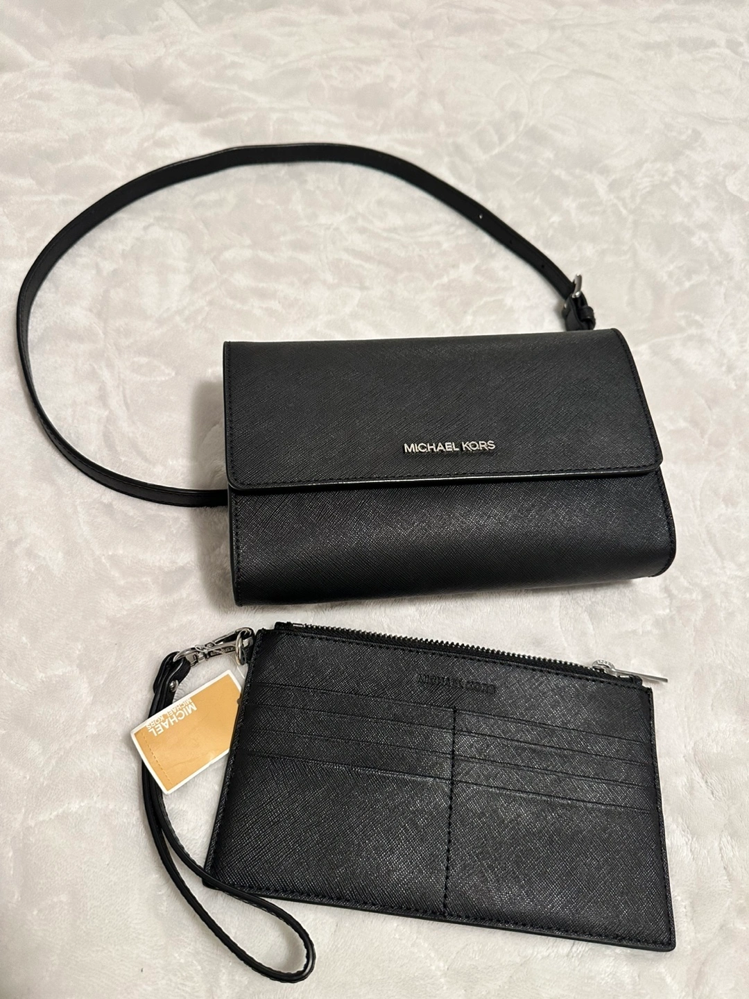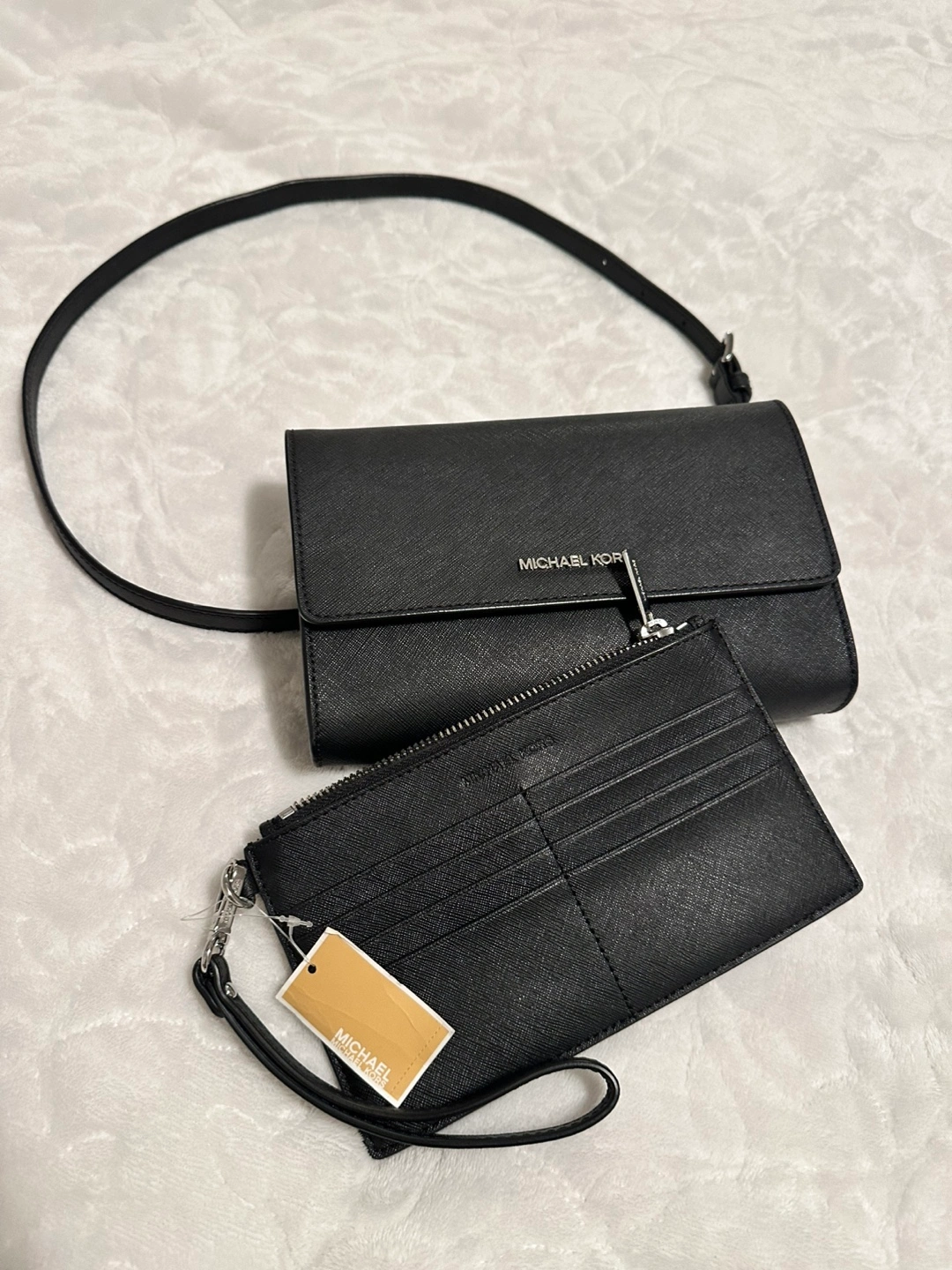Black crossbody bag with chain strap and matching wallet. The wallet has a wrist strap.