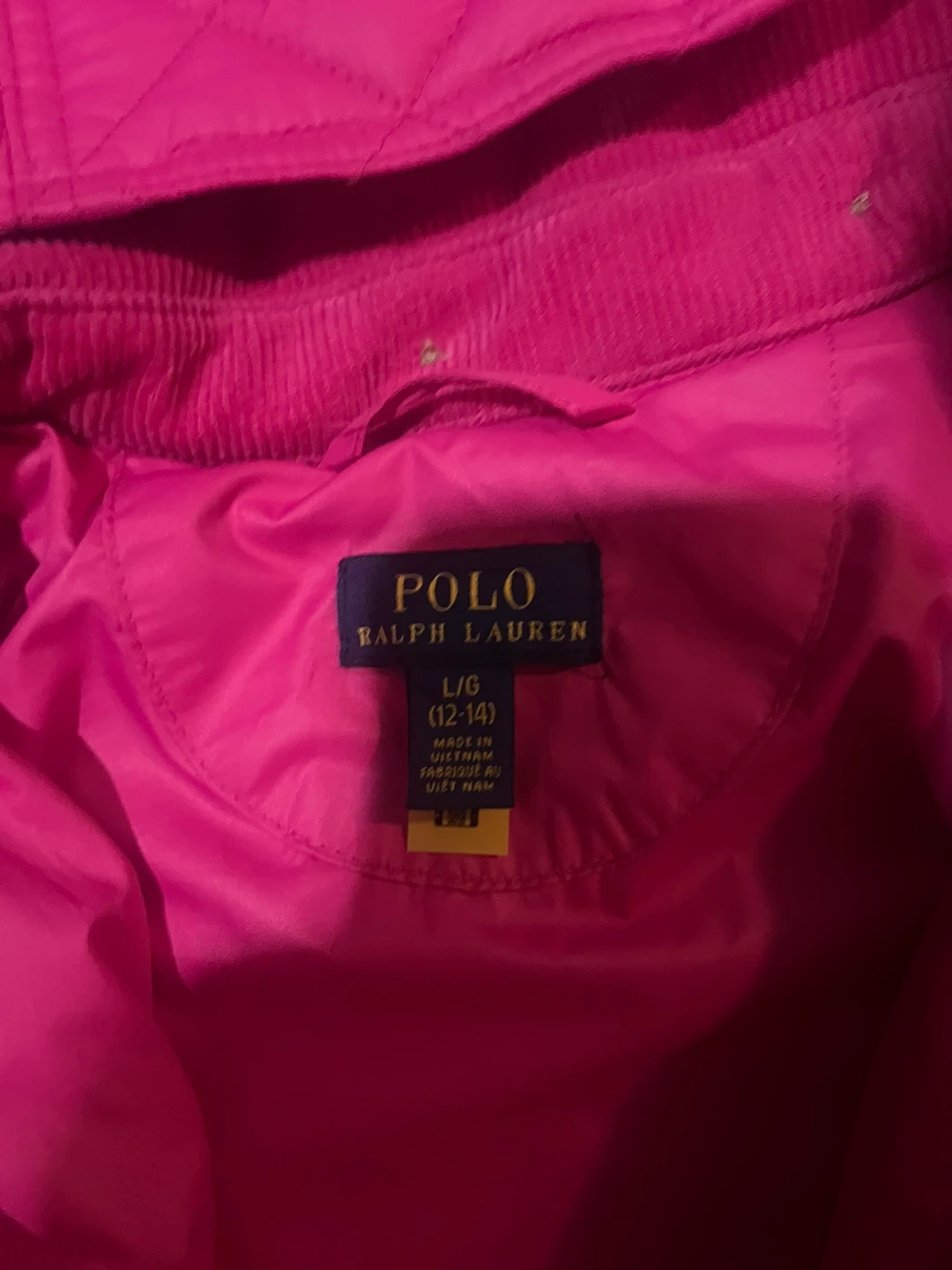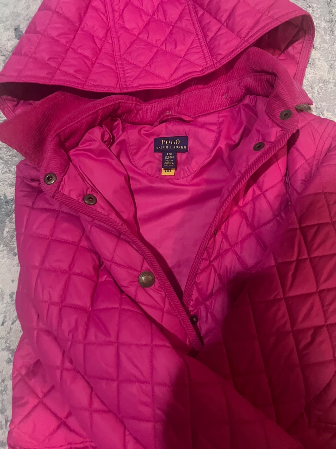 Selling a cute Polo Ralph Lauren quilted jacket in a vibrant pink color! It's a size L/G (12-14) and features a quilted design with a hood. Great for keeping warm and stylish!