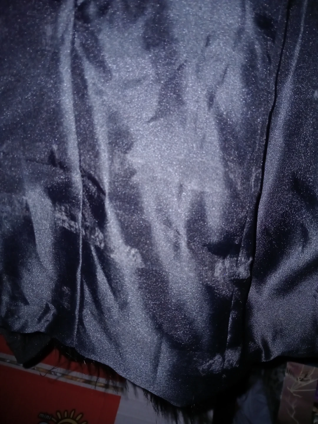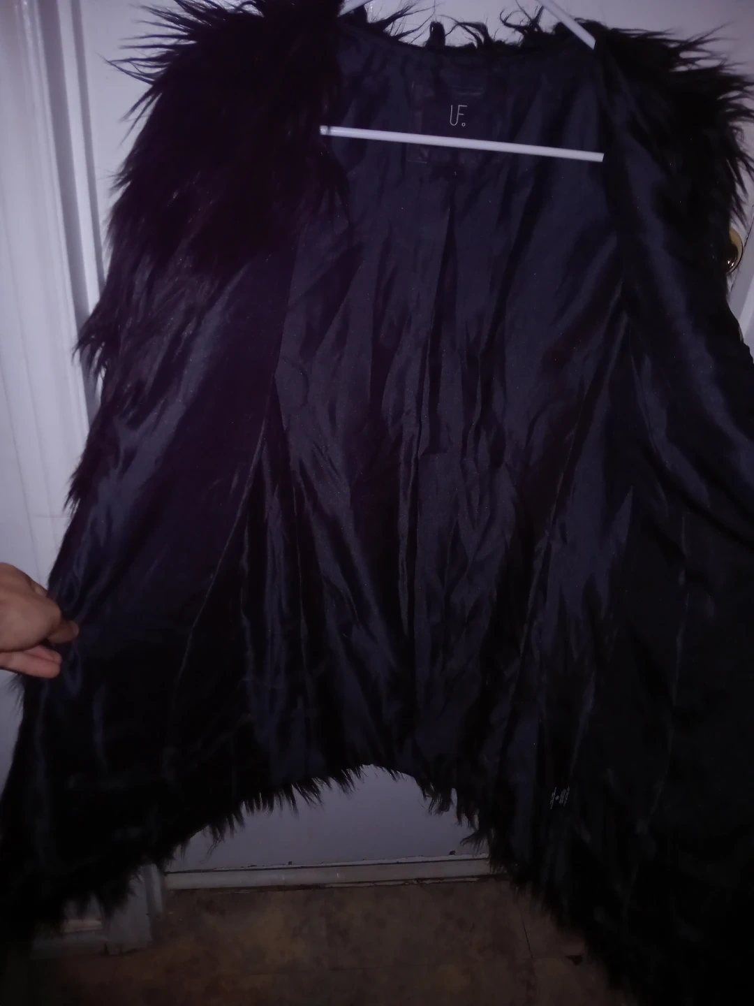 This is a black Unreal Fur jacket with a faux fur exterior. It's a size small. The interior has a line from dust as its been sitting as seen in pictures not very noticeable as for the rest of the jacket in amazing condition askimg $65 obo