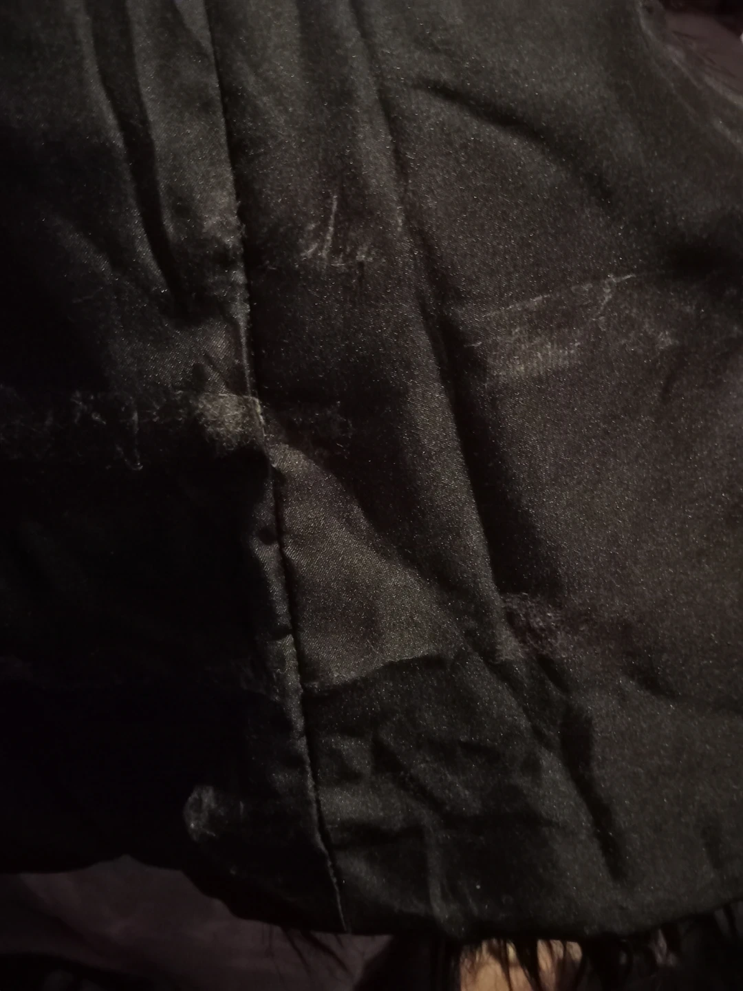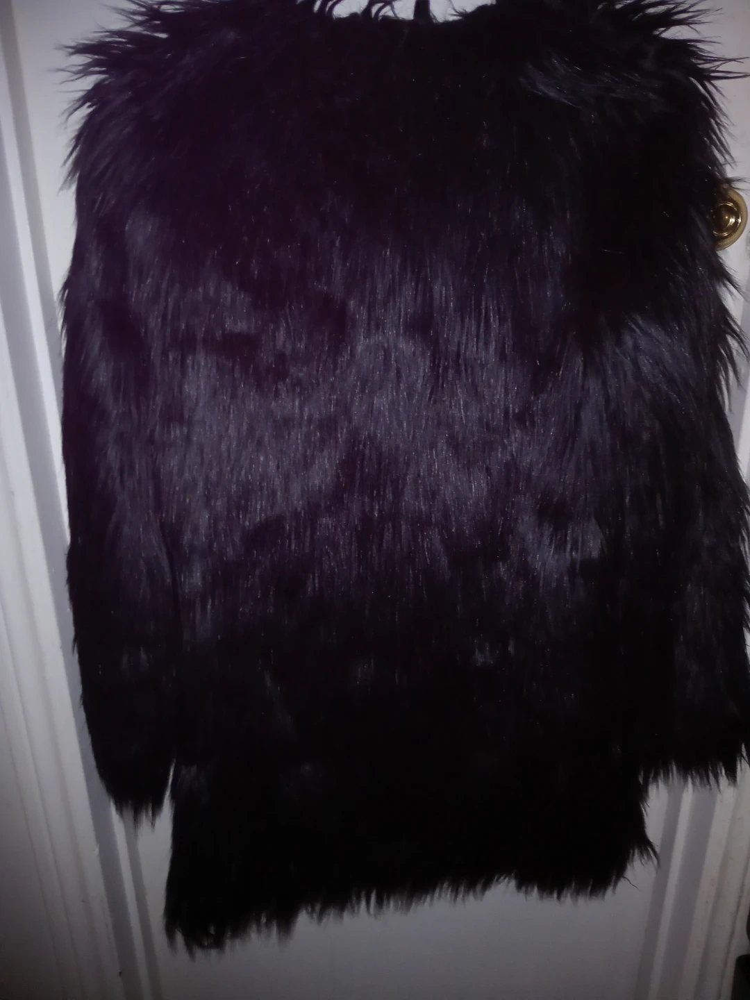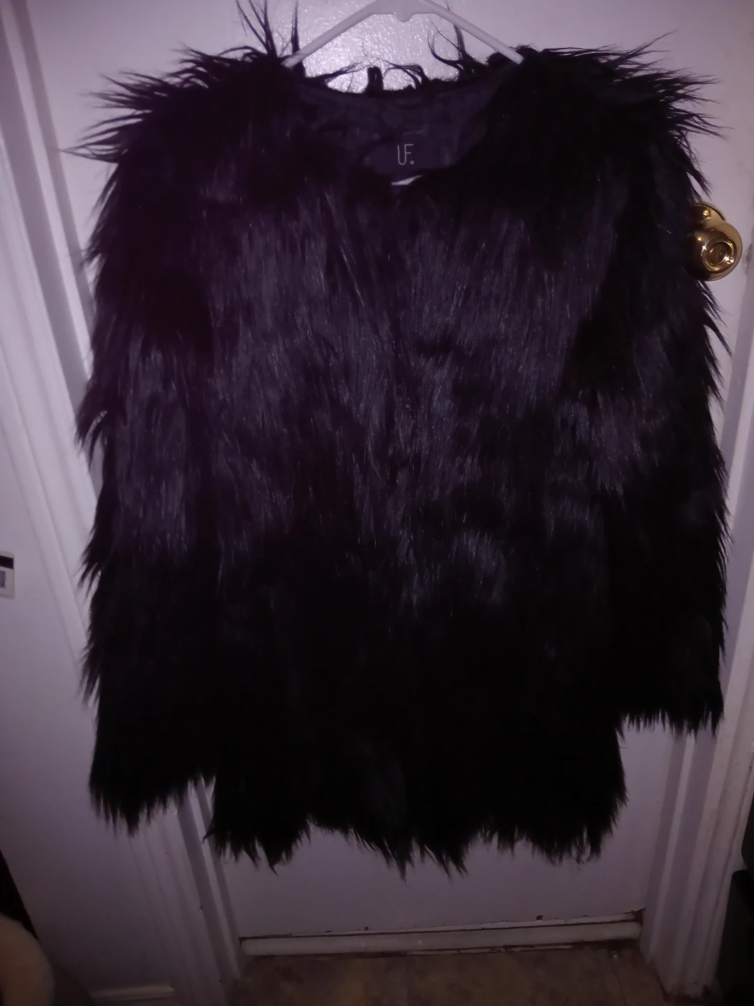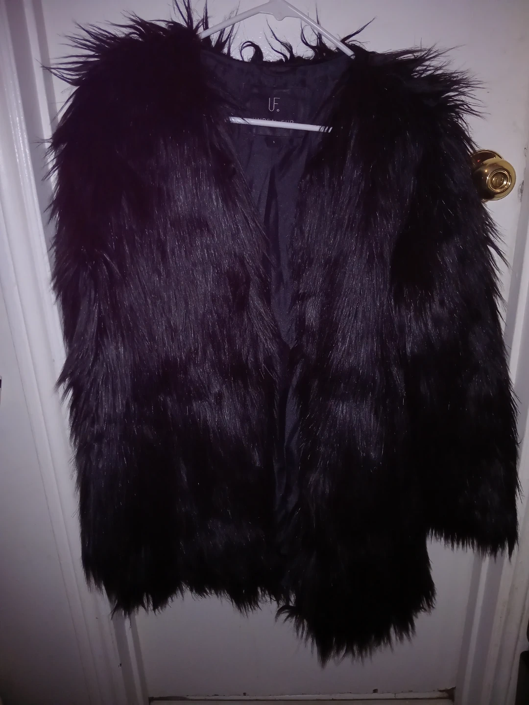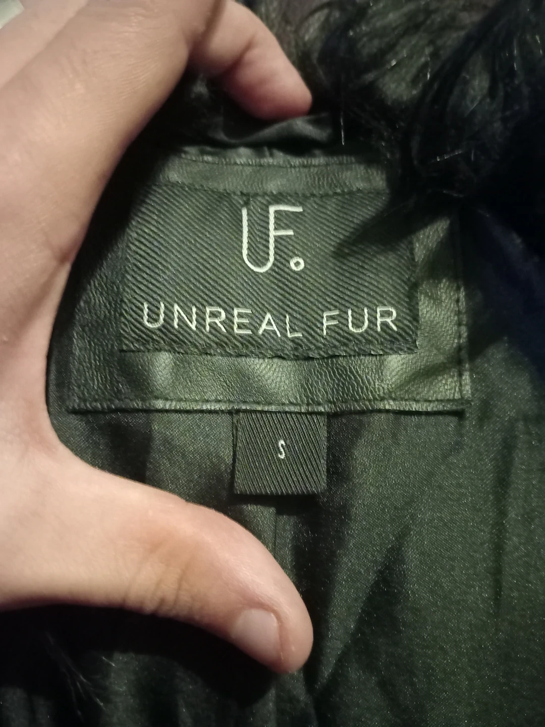 This is a black Unreal Fur jacket with a faux fur exterior. It's a size small. The interior has a line from dust as its been sitting as seen in pictures not very noticeable as for the rest of the jacket in amazing condition askimg $65 obo