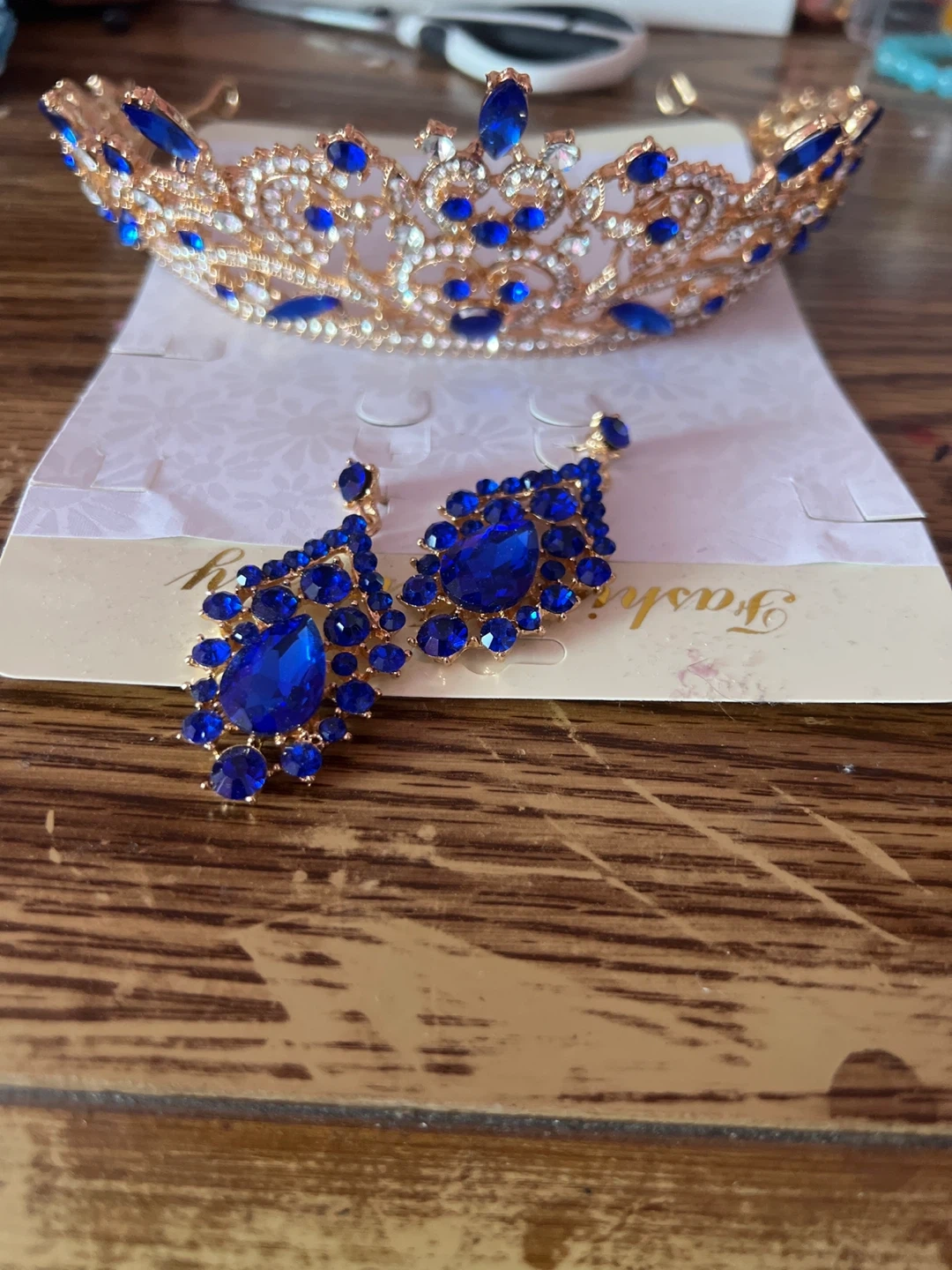 This is a gorgeous set featuring a tiara and matching dangle earrings, both adorned with sparkling blue rhinestones and gold-tone metal. The tiara has a classic design with intricate detailing. The earrings are designed to catch the light beautifully. It's perfect for special occasions like pageants, birthdays, or themed parties!