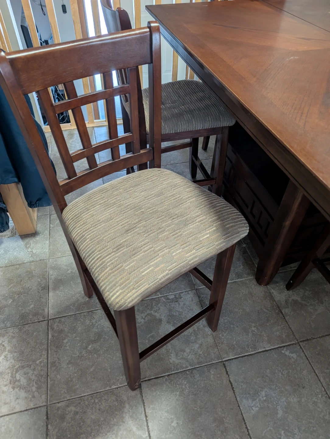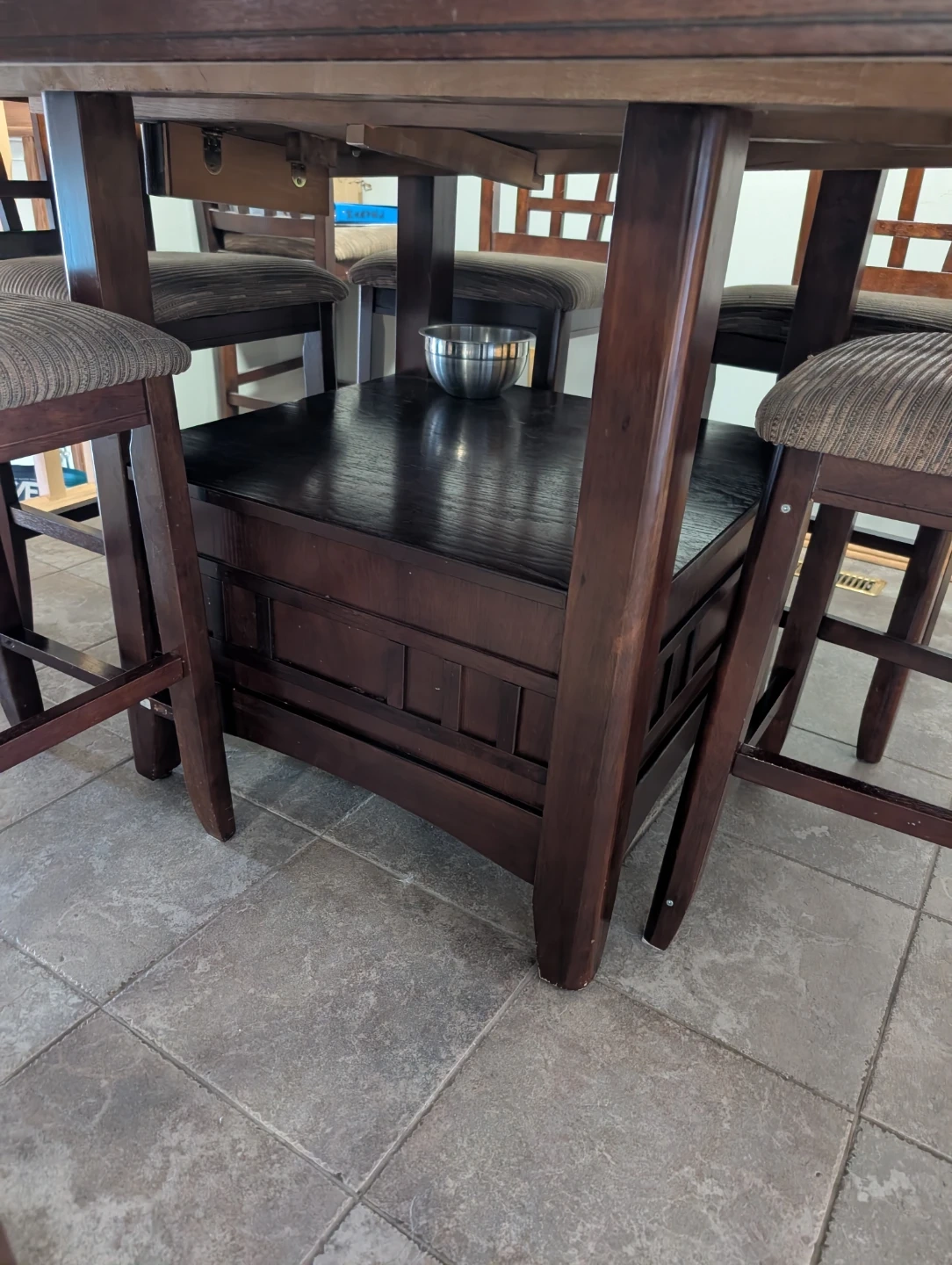 This is a dark wood dining table with eight upholstered chairs. The chairs have a patterned fabric seat. The table has a leaf extension, and there's a storage compartment built into the table base. It's a nice set for family dinners!