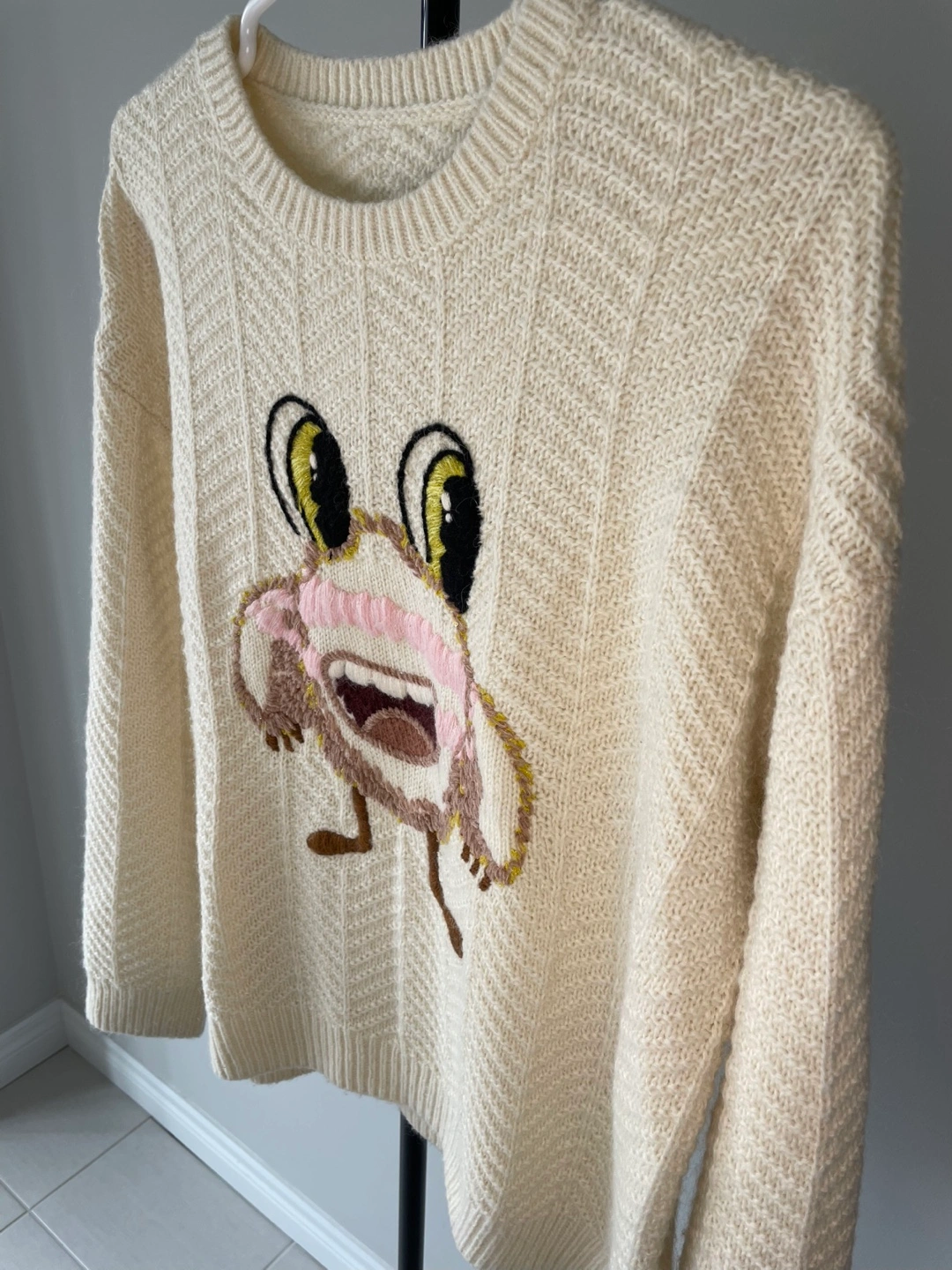 A cream-coloured knit sweater from FIVE PLUS featuring a fun embroidered monster graphic. It's made with a blend of polyester, acrylic, and spandex for comfort and stretch. Perfect for adding a playful touch to your outfit!