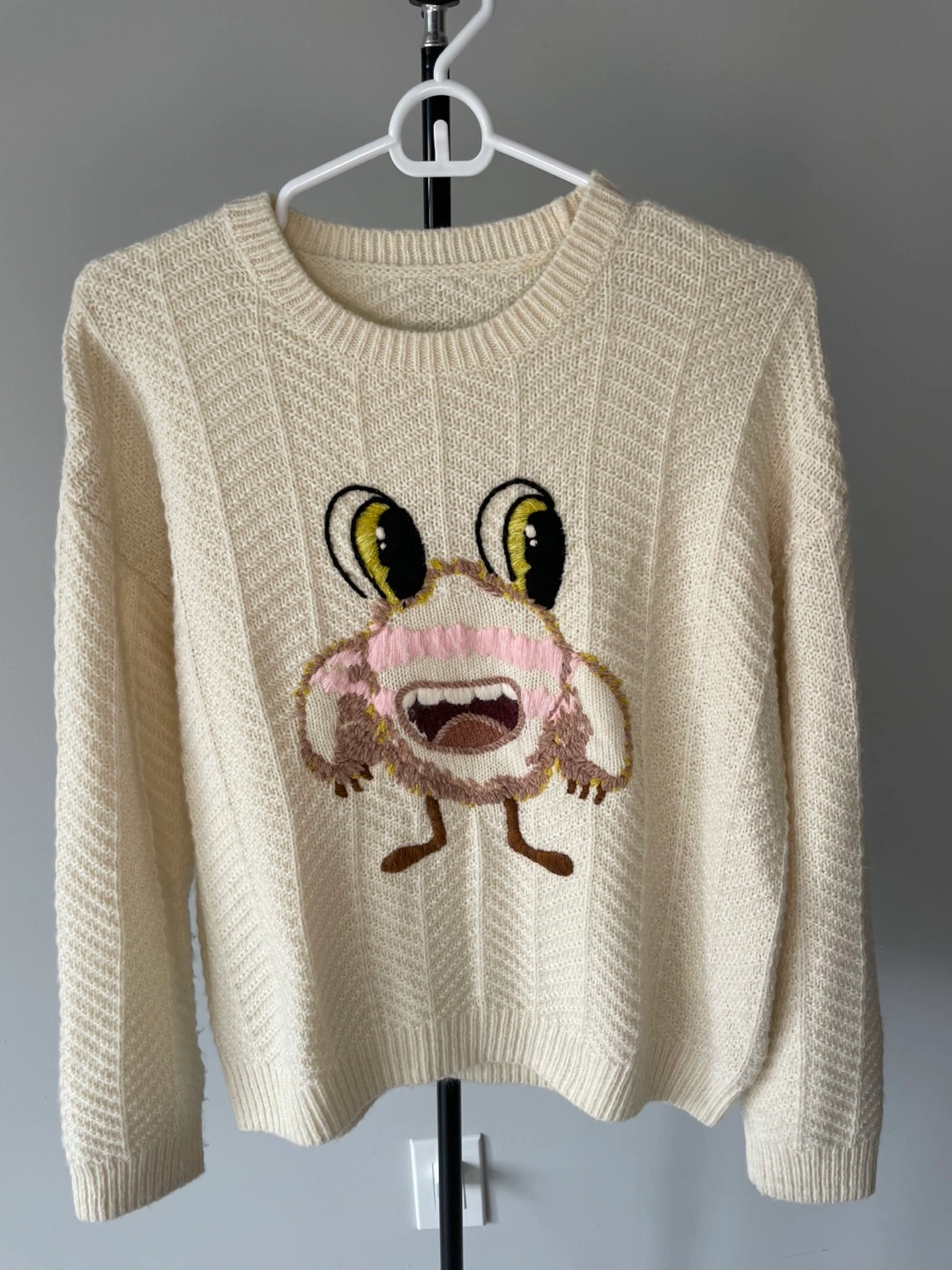 A cream-coloured knit sweater from FIVE PLUS featuring a fun embroidered monster graphic. It's made with a blend of polyester, acrylic, and spandex for comfort and stretch. Perfect for adding a playful touch to your outfit!