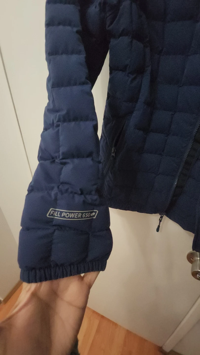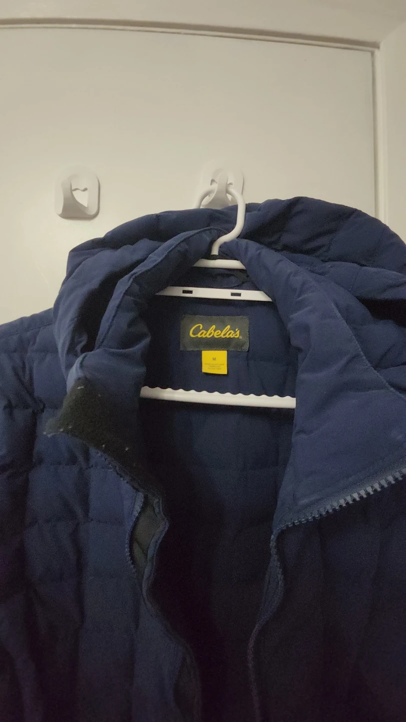 Navy blue quilted puffer jacket with a hood, made by Cabela’s. it’s solid blue with a zip front, zippered pockets, and a “Cabela’s” label inside.