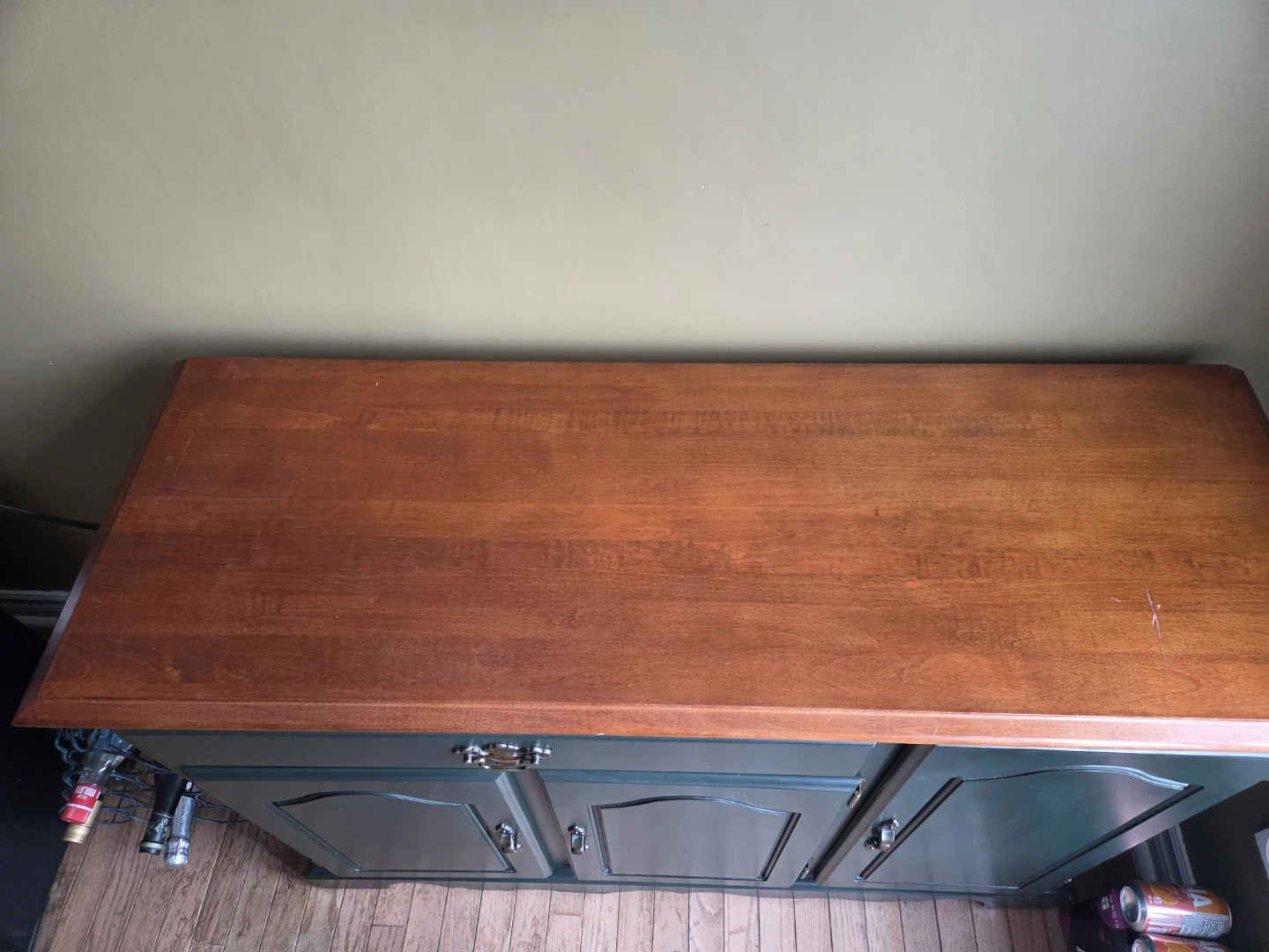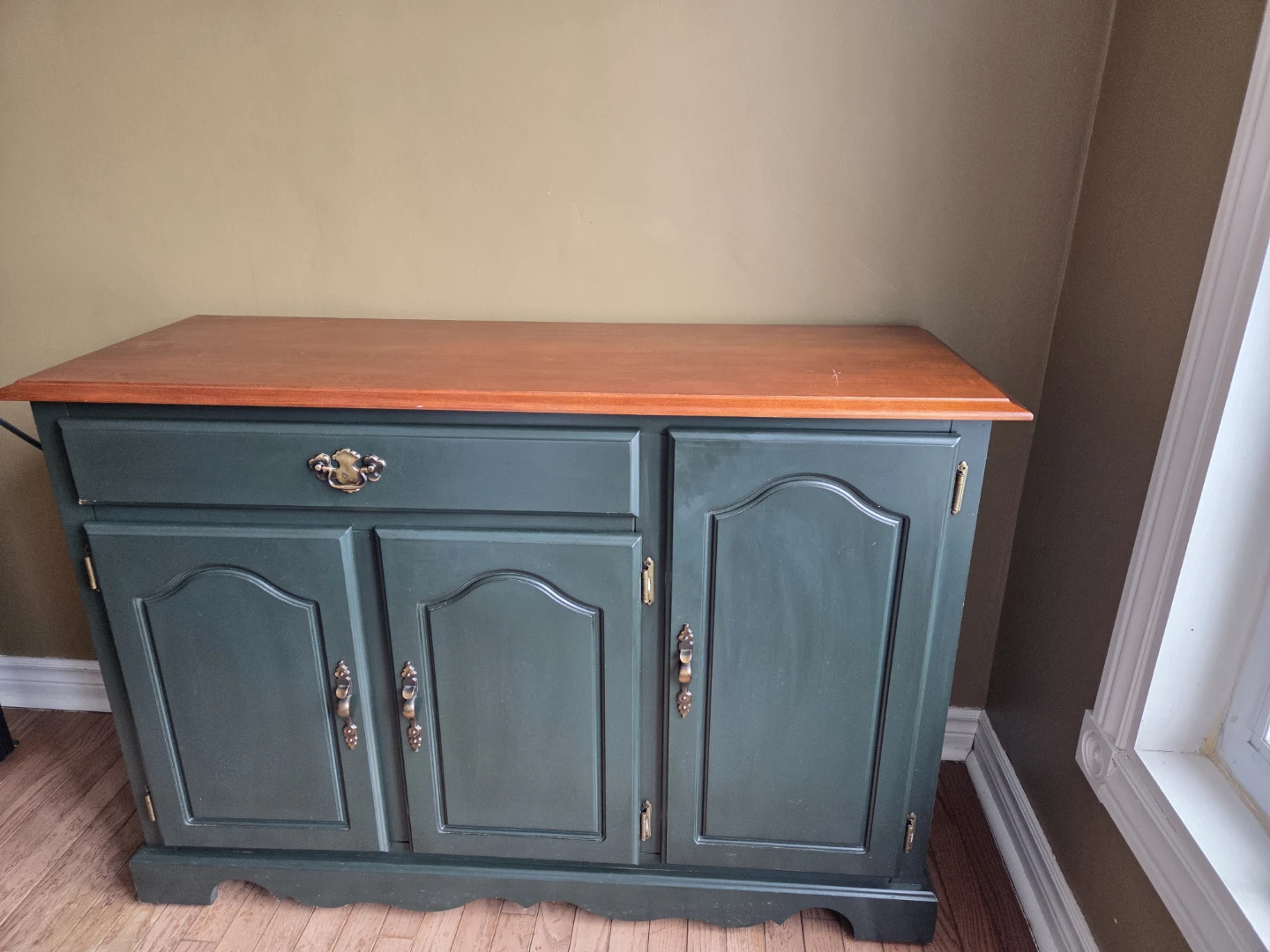 This sideboard has a dark green painted finish with decorative brass hardware. It features a wooden top and three cabinet doors, offering ample storage. It's a great piece for a dining room or living area.