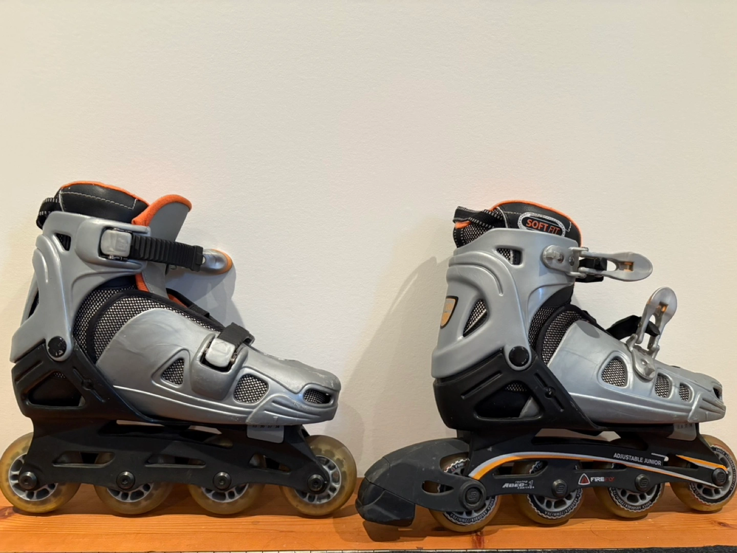 -Pair of adjustable inline skates in silver and orange. Used but good condition.