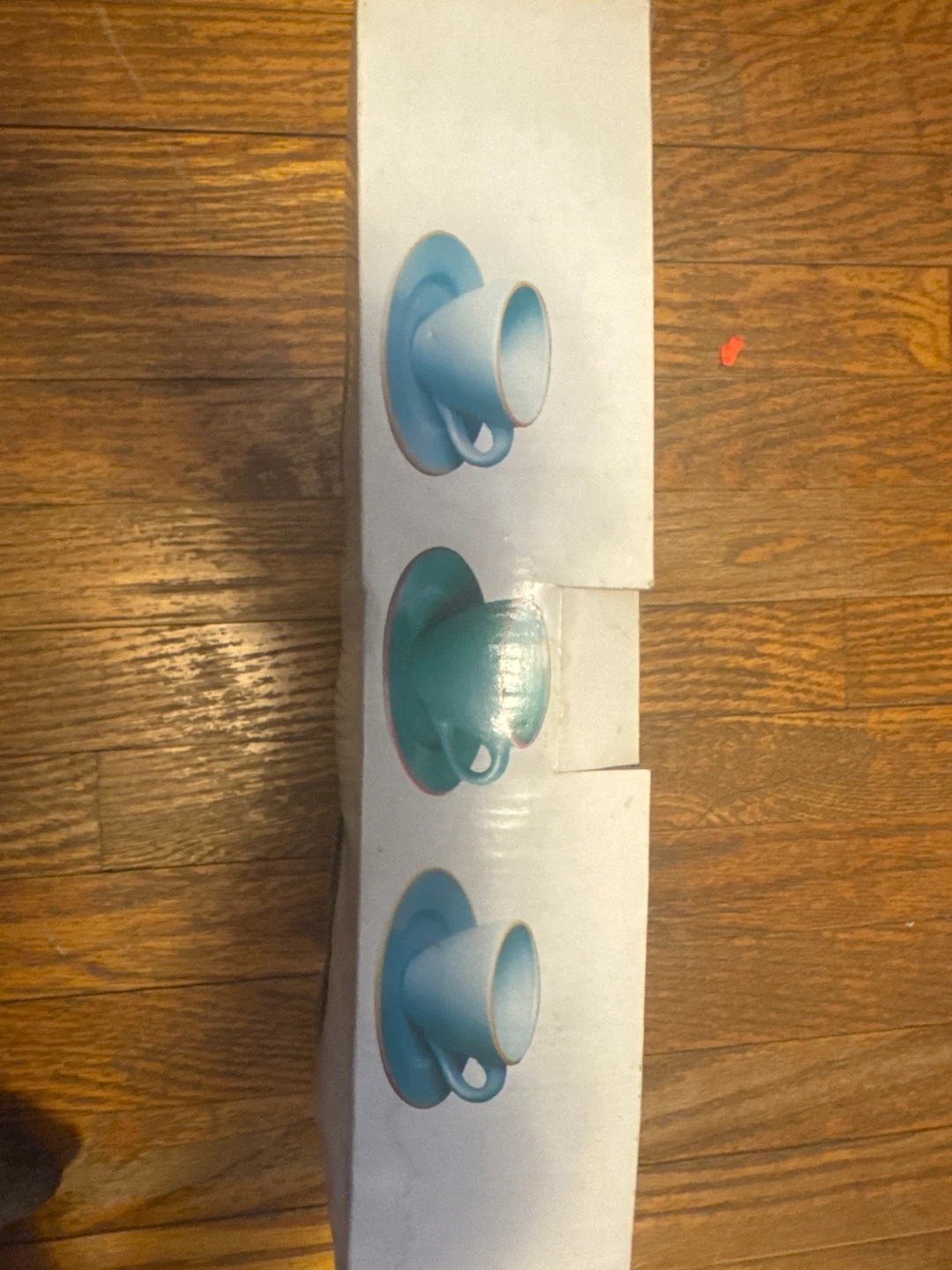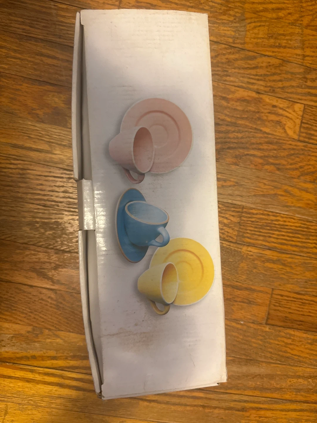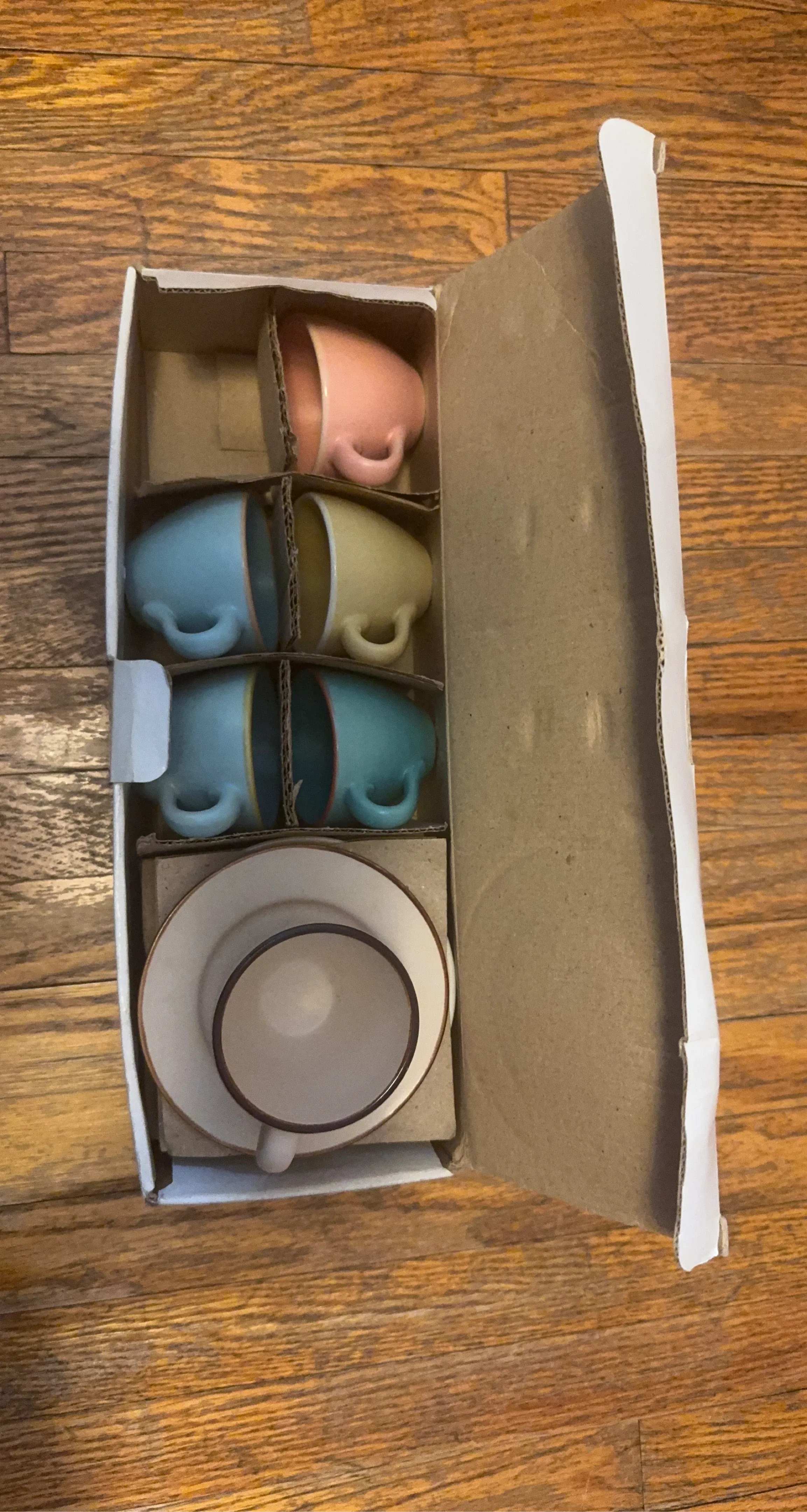 Includes four ceramic teacups and saucers in pastel colours: pink, yellow, light blue, and teal. Packaged in original box. Perfect for a lovely afternoon tea!