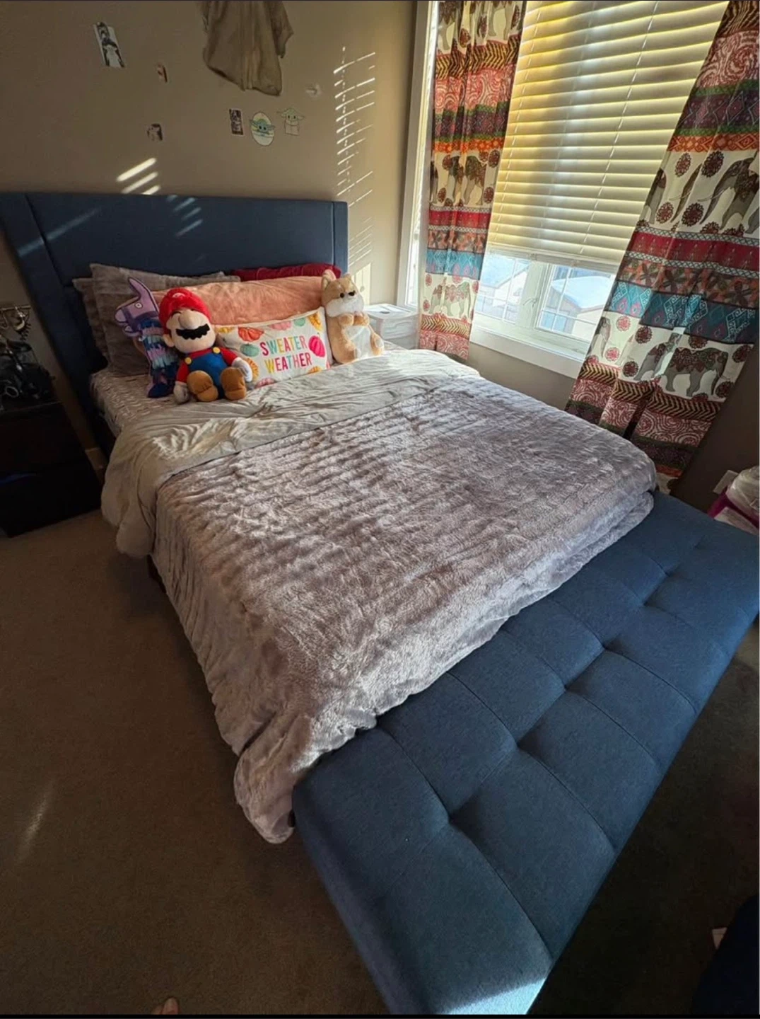 Blue Upholstered Storage Bench with mattress