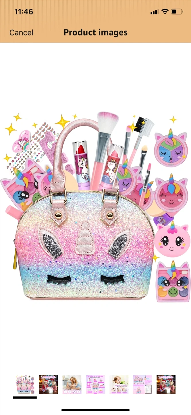 This kids washable makeup kit comes with a sparkly unicorn handbag. It's designed for children aged 3 and up. The makeup is water-soluble and non-toxic, ensuring safe play.